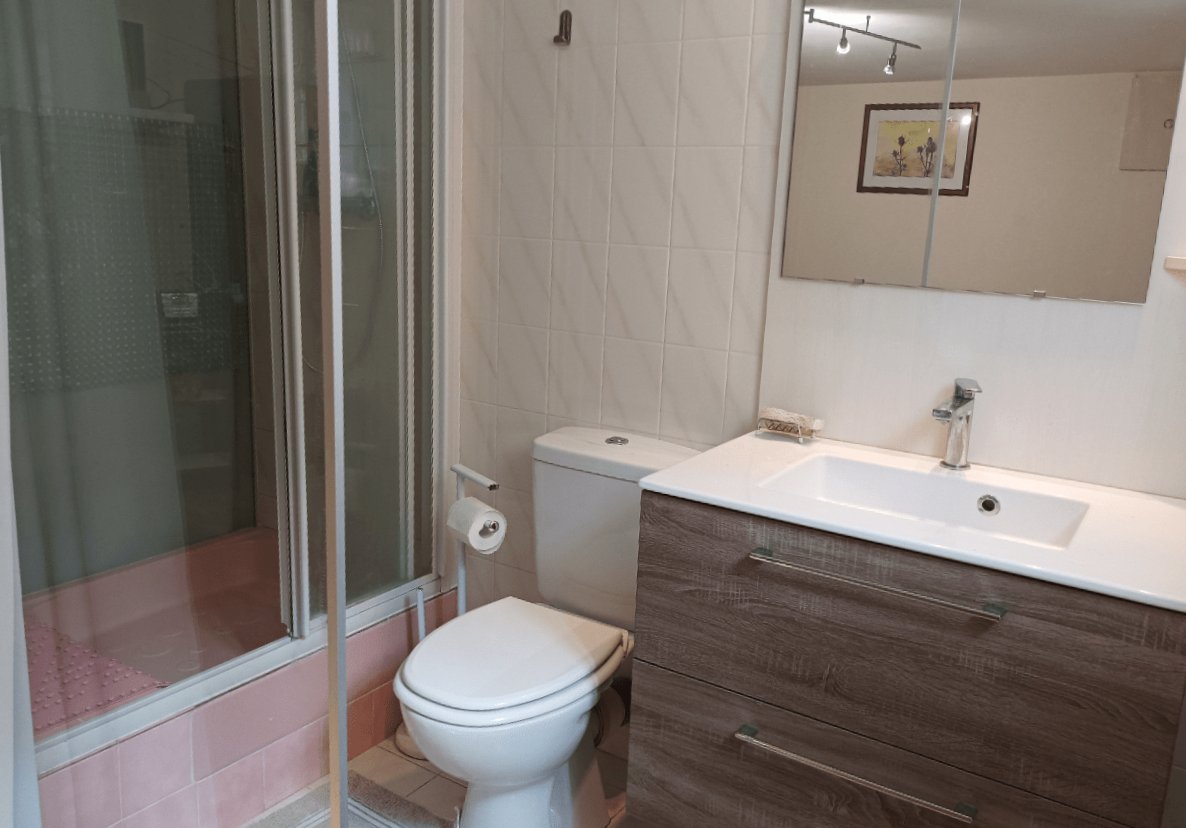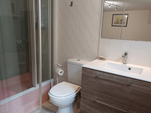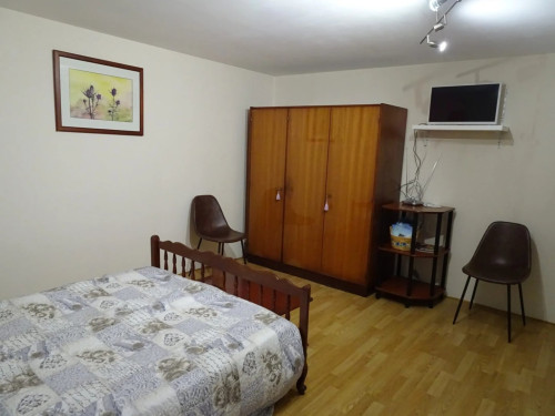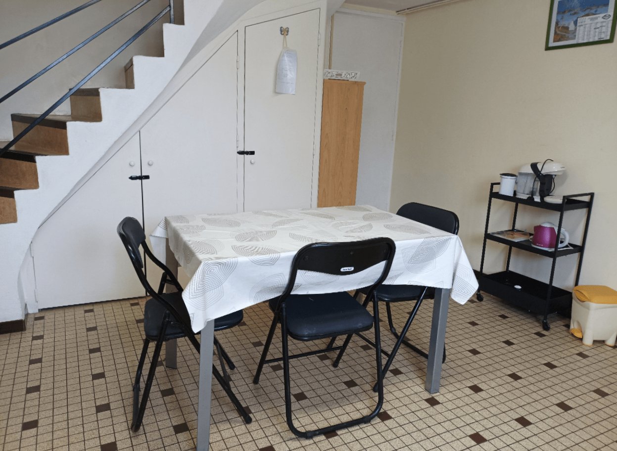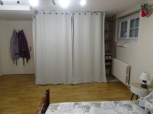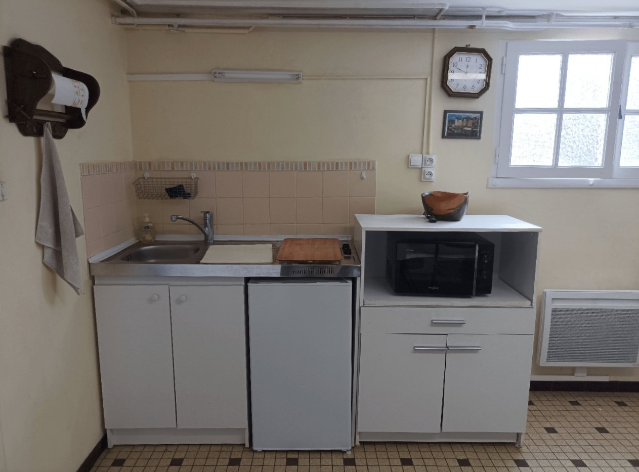 L'appartement comprend une grande salle avec coin cuisine équipée, un couloir et une chambre avec salle de bains (douche, lavabo + WC) séparée par un rideau. Chaque pièce est chauffée par un radiateur électrique.