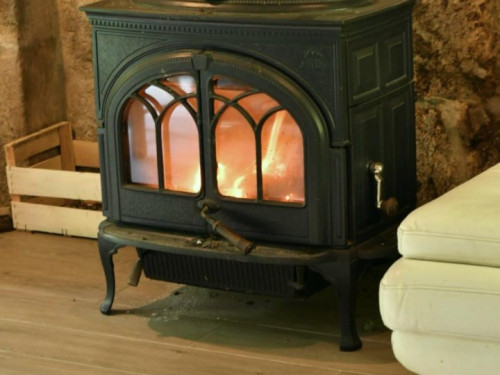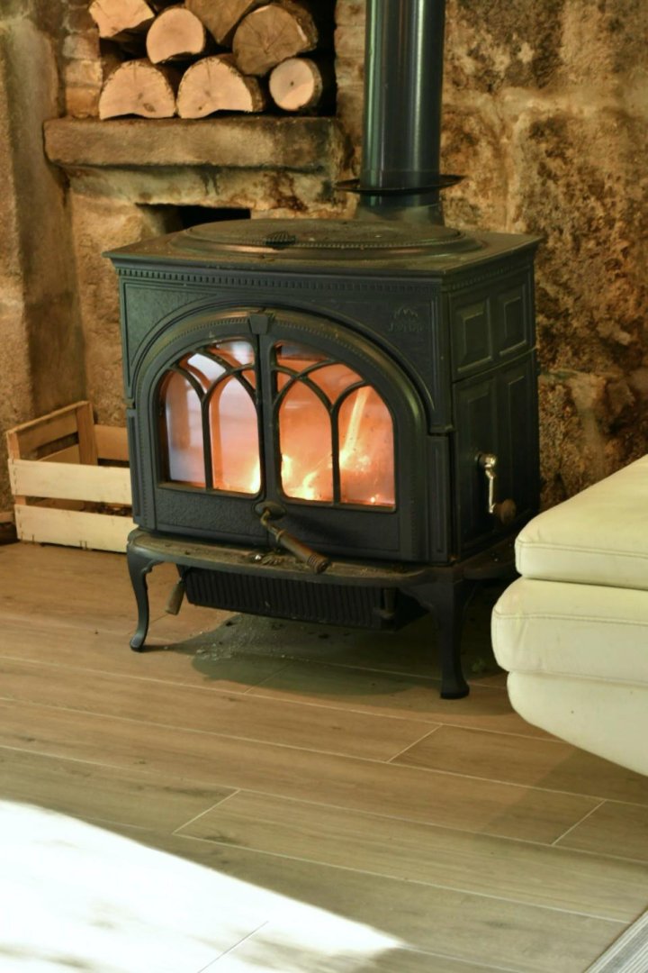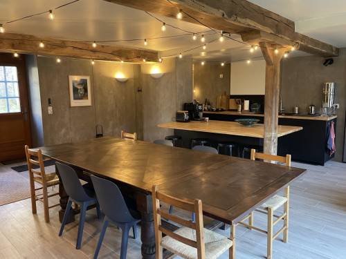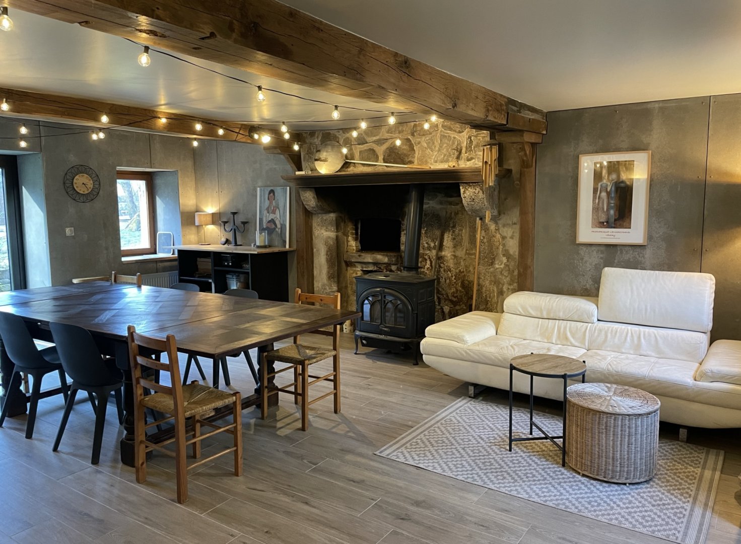 - Pièce de vie équipée d'une cuisine, une grande table, un canapé et un poêle à bois.
