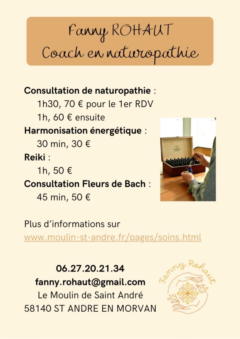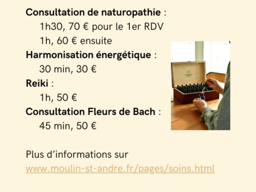 Nous proposons des soins sur place, n'hésitez pas à consulter notre site www.moulin-st-andre.fr/pages/soins.html