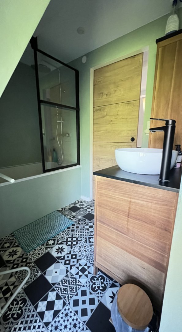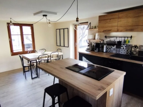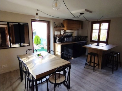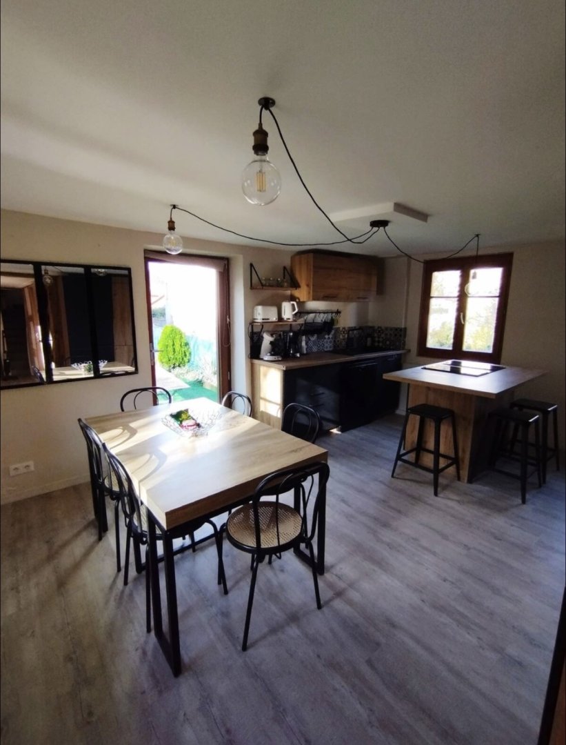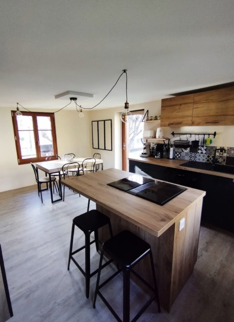 Au premier étage : la cuisine ouverte sur le séjour et la terrasse est entièrement équipée pour 4 personnes : micro-ondes, frigo/congélateur, lave-vaisselle (dosettes fournies), plaque à induction, four, machine à café Senseo (dosettes incluses), cafetière filtre, bouilloire (thé fourni), grille-pain, appareil à raclette/fondue et essentiels (sel, poivre, huile, vinaigre).
