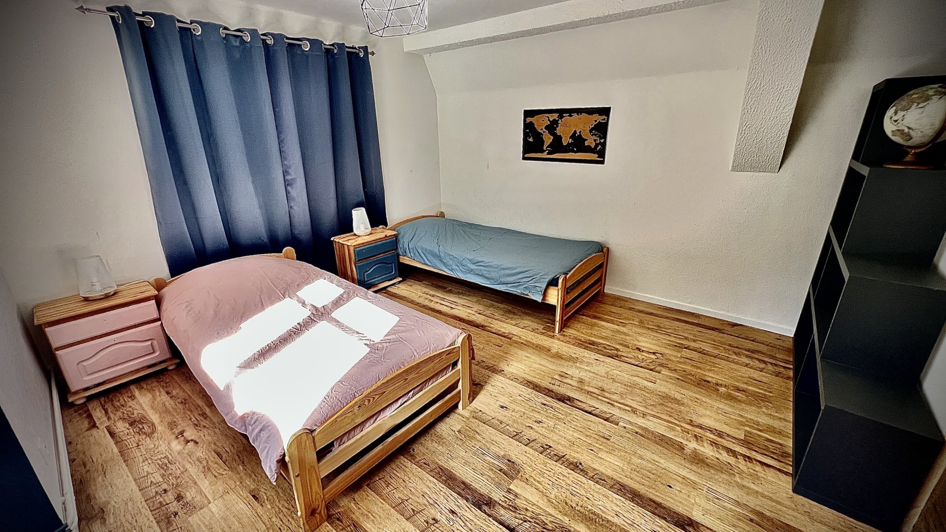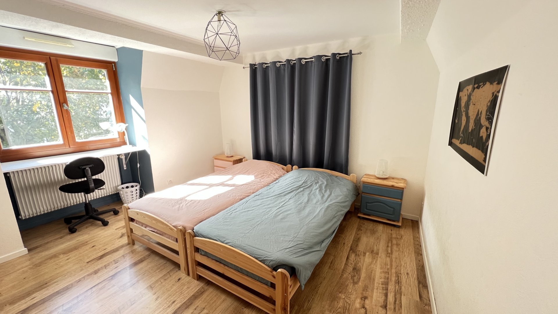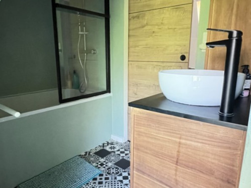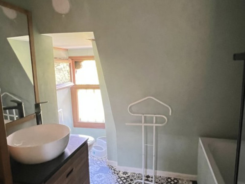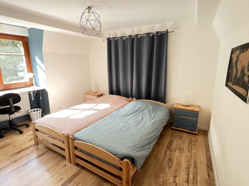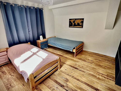 À l’étage, une chambre avec 2 lits 90x200 (pouvant être rapprochés), une salle de bain avec baignoire/douche et un second WC.