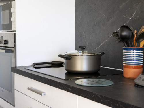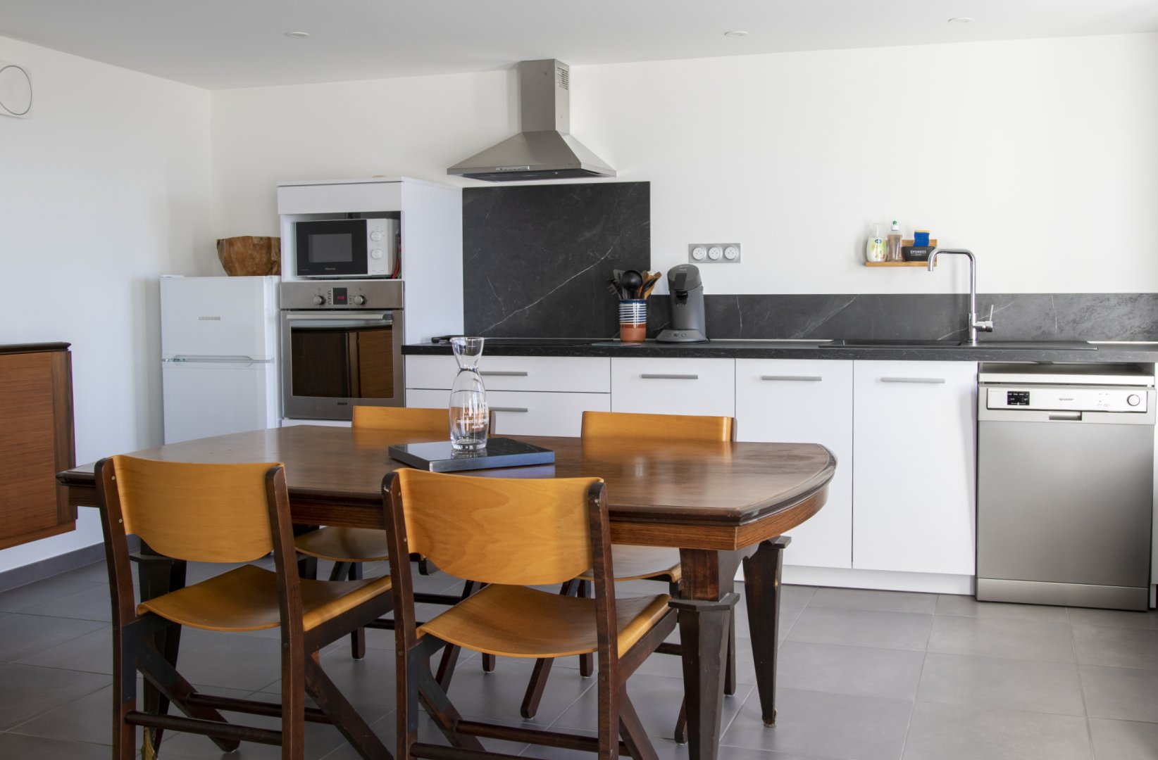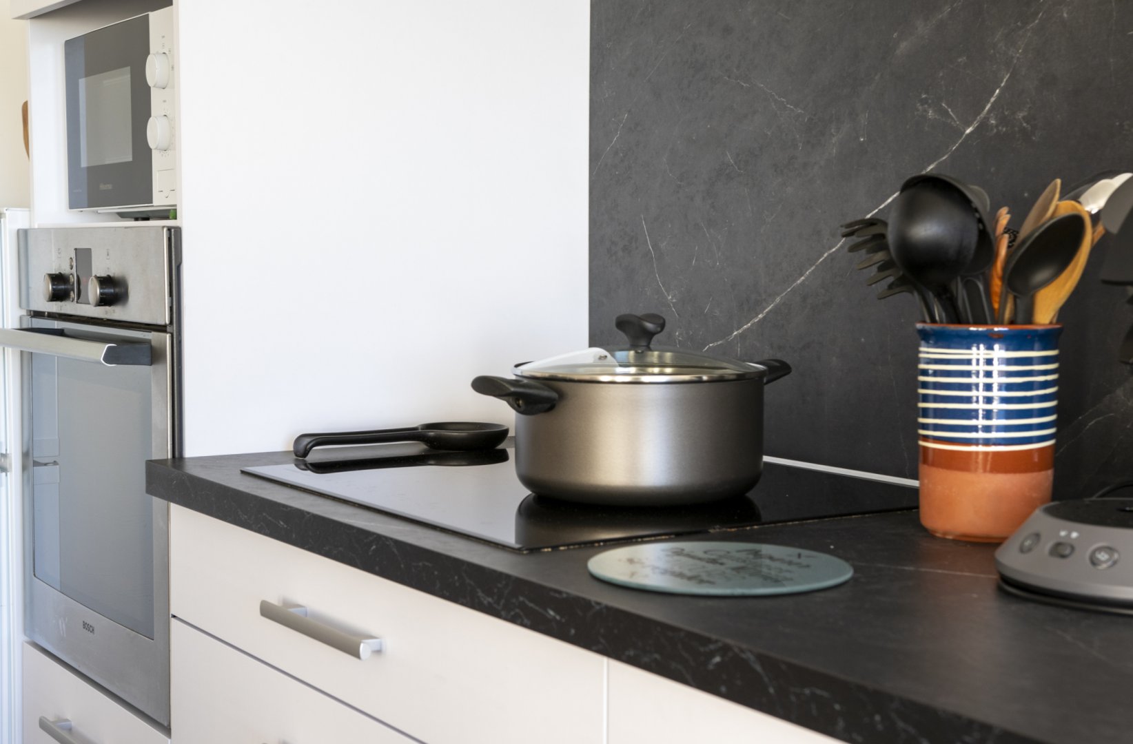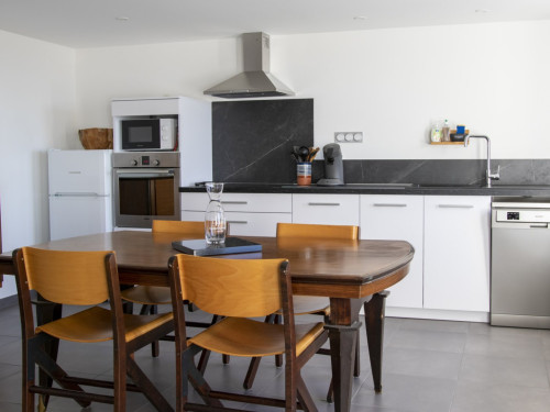 Il se compose d’une cuisine entièrement équipée : lave-vaisselle, four, micro-ondes, plaque induction et tous les ustensiles nécessaires pour se concocter de bons petits plats.