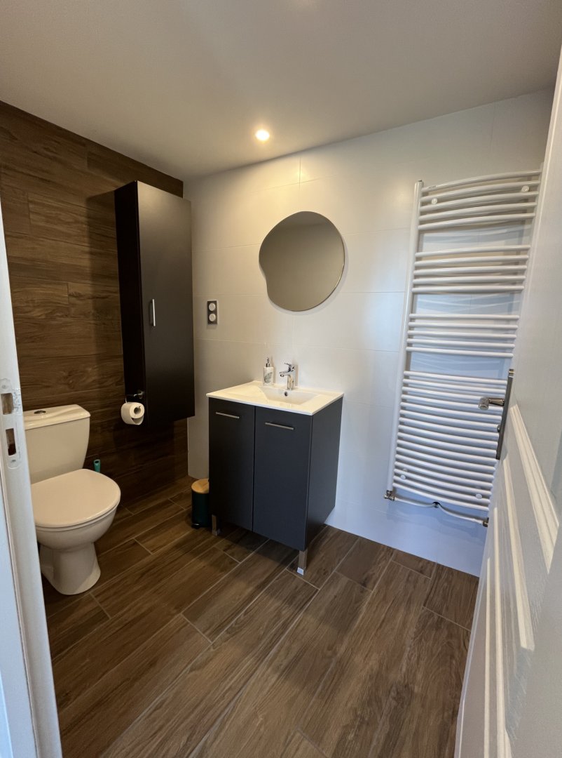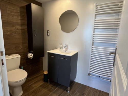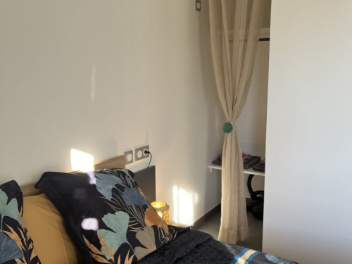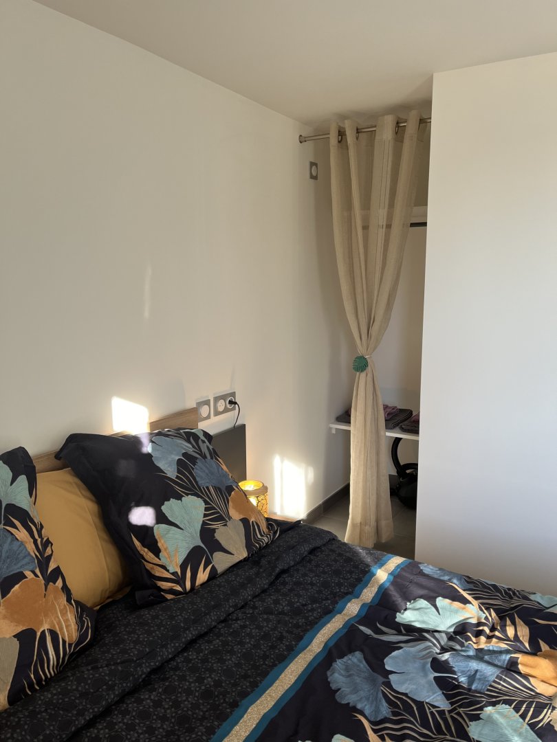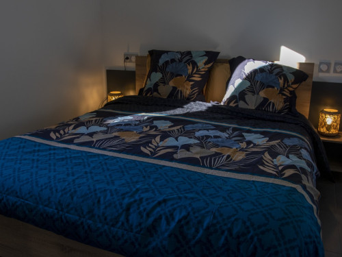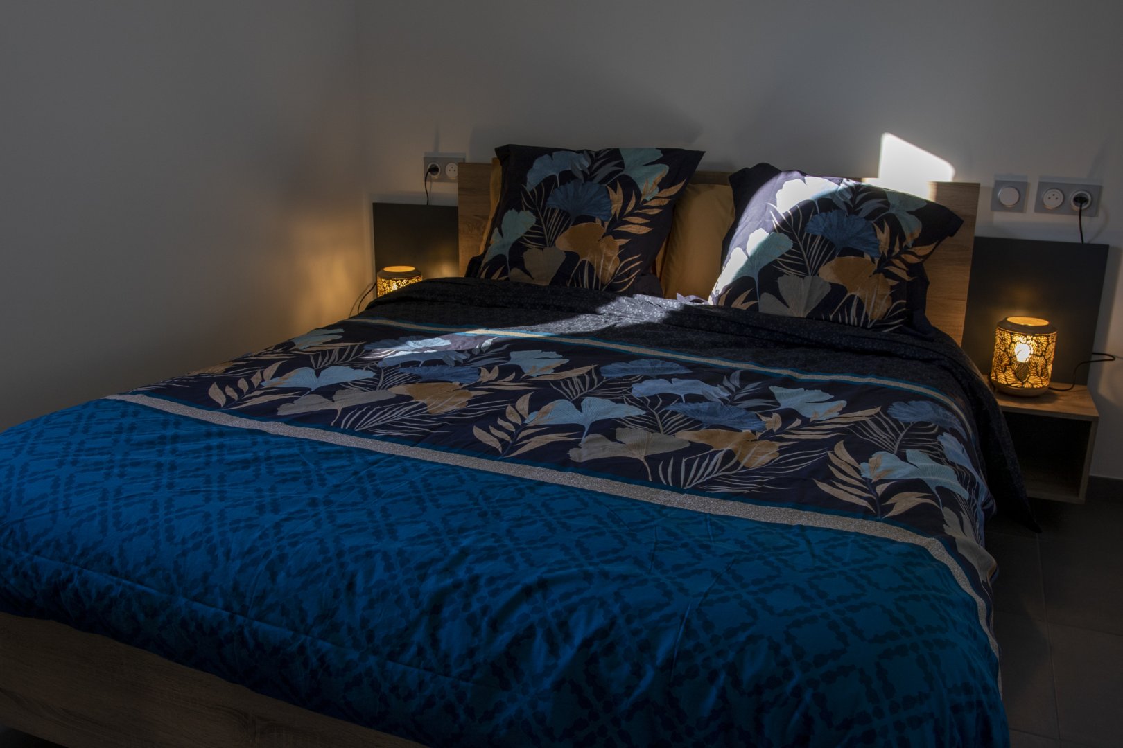 La salle de bain avec douche à l’italienne est accessible depuis la grande chambre équipée d’un lit queen size (160x200) où vous pourrez passer des nuits reposantes et au calme.