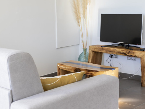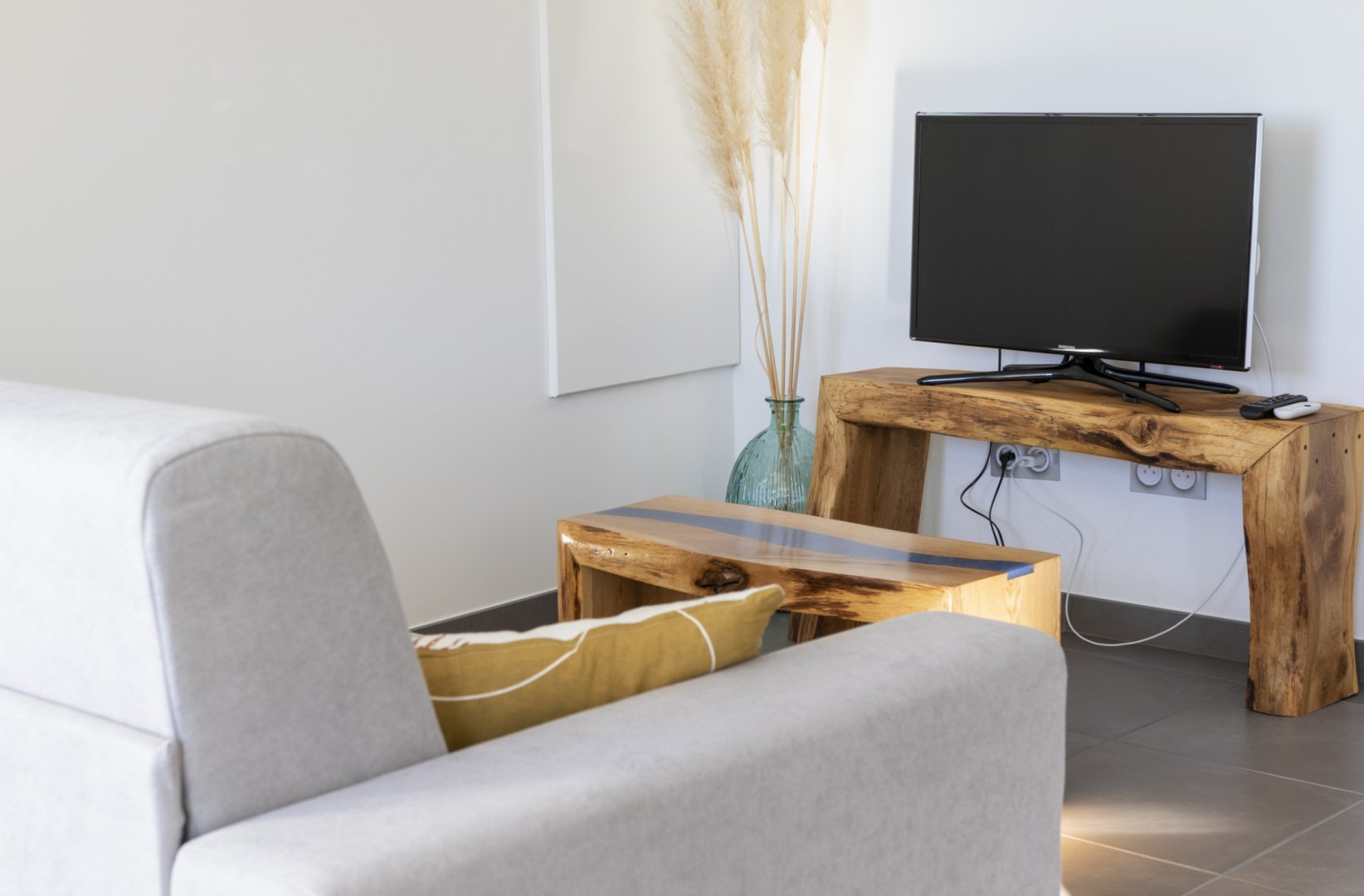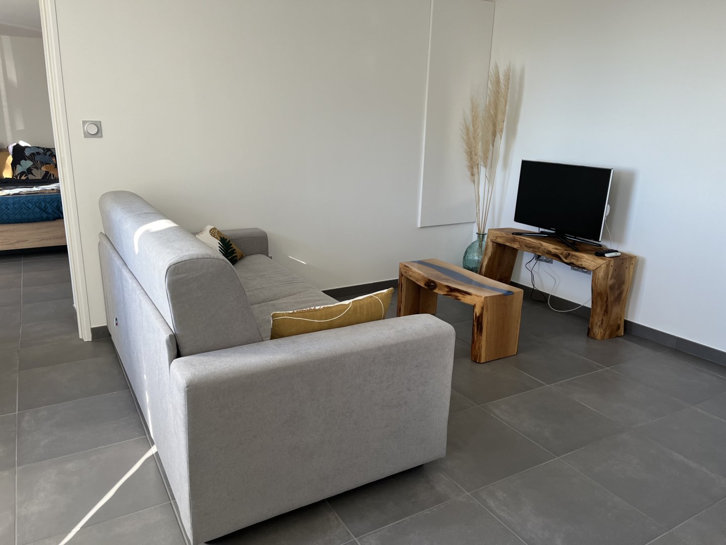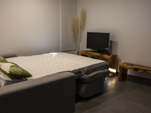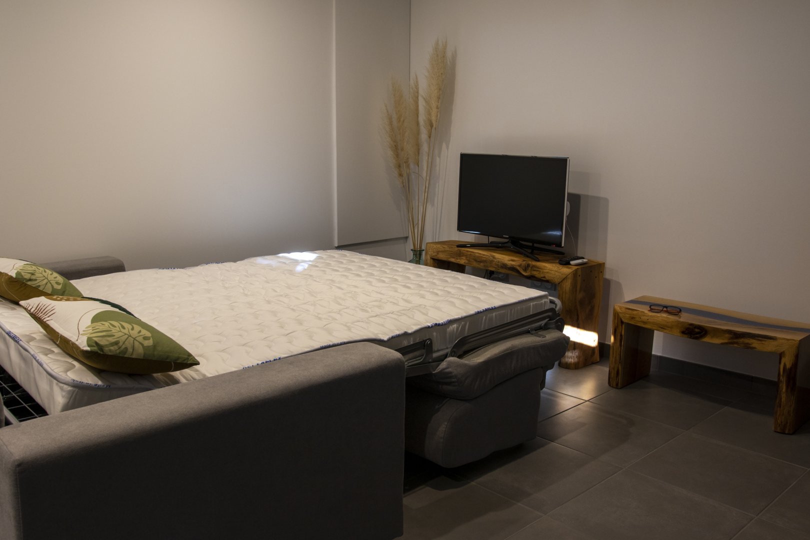Dans le coin salon, le canapé convertible peut accueillir 2 personnes.