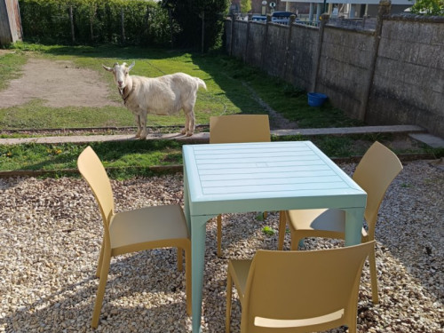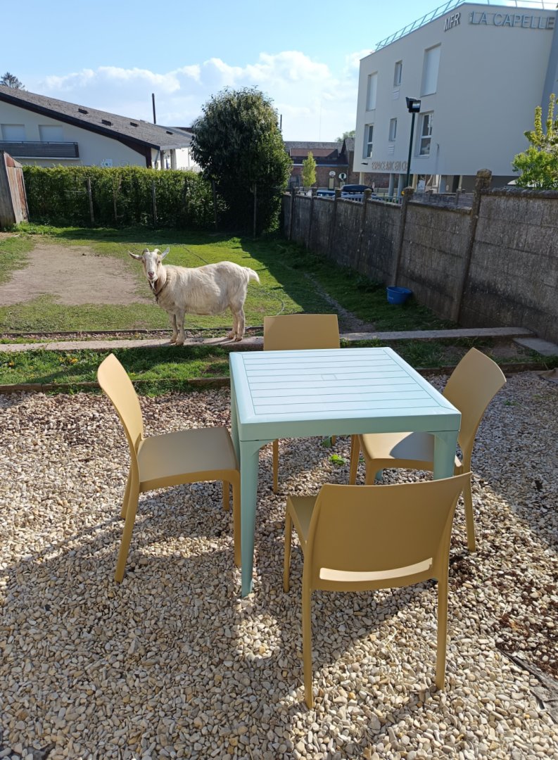 Vous pourrez profiter de la terrasse sous l'œil attentif de Maggy, la chèvre (pas de panique, elle est attachée et ne viendra pas manger les saucisses sur le barbecue 😅).