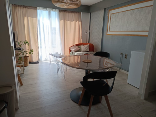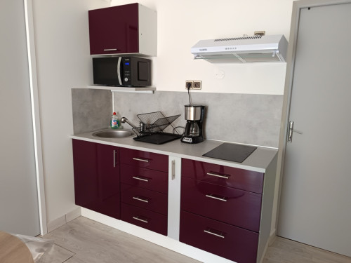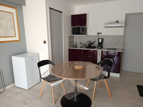 L'appartement est constitué de 2 pièces : la cuisine équipée, très lumineuse grâce à la baie vitrée, est ouverte sur le salon. La salle d'eau se situe dans la chambre.