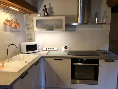 Cuisine équipée avec réfrigérateur-congélateur, lave-vaisselle, plaque induction, four, micro-ondes, cafetière, service à raclette, grille-pain, aspirateur, cellier avec lave-linge, planche à repasser + fer.