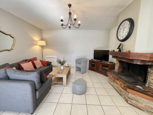- une spacieuse et lumineuse pièce à vivre avec cheminée donnant sur la terrasse plein Sud Est, équipée d'un canapé lit, table basse, TV, une grande table avec 4 chaises et banc, vaisselier, Fibre.