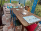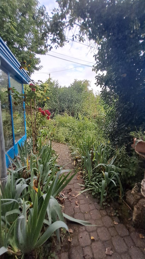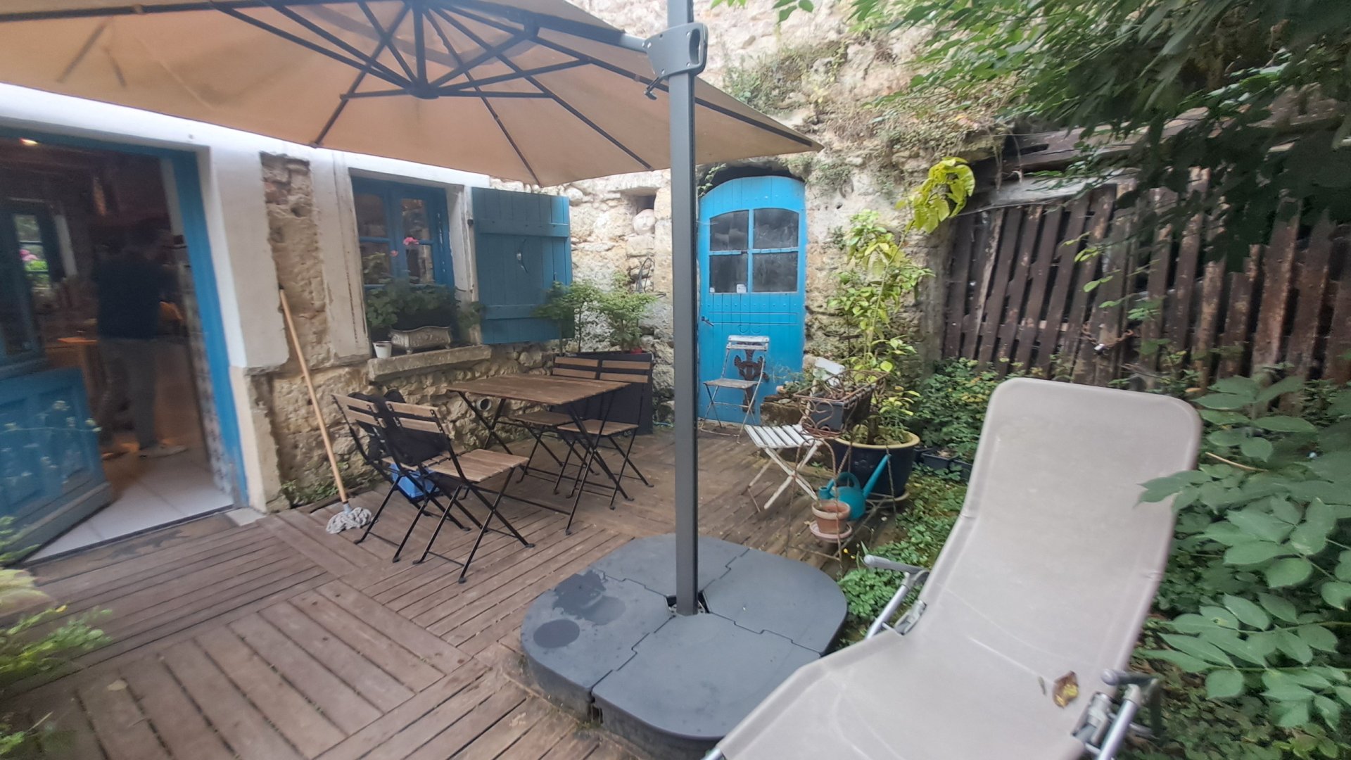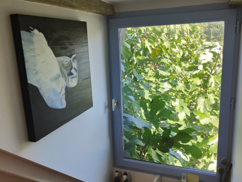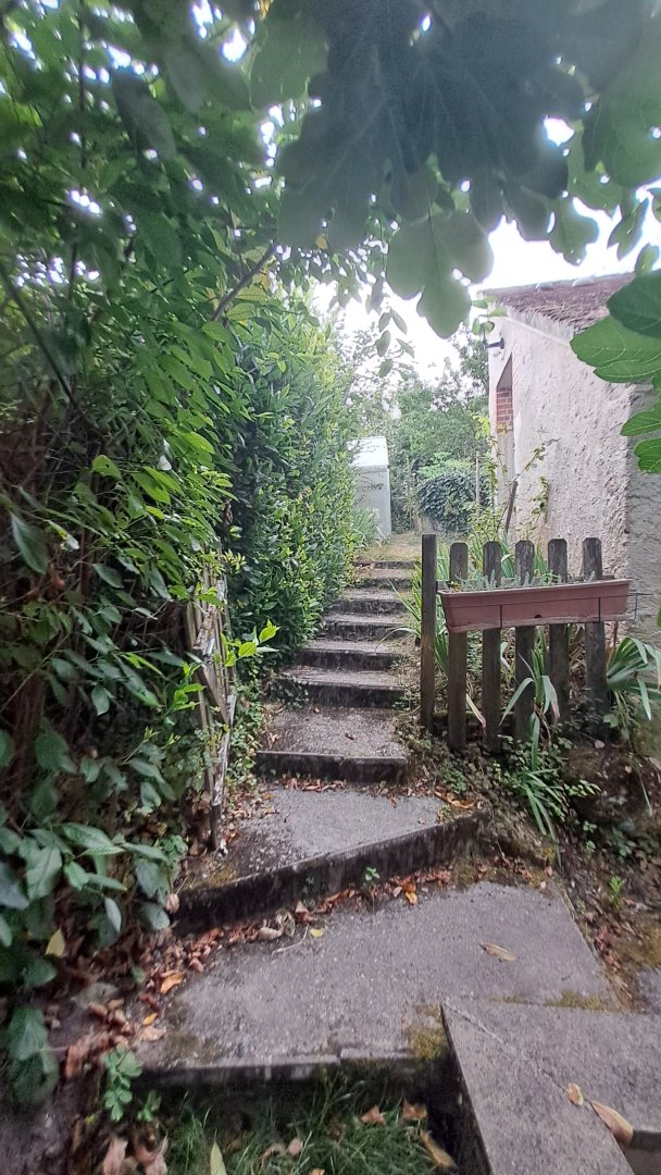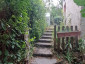 Cour, jardin et terrasses ombragée et ensoleillée en bas, jardin arboré avec serre et hamac en haut du coteau, accès par escalier extérieur ou depuis le 2ème niveau de la maison.