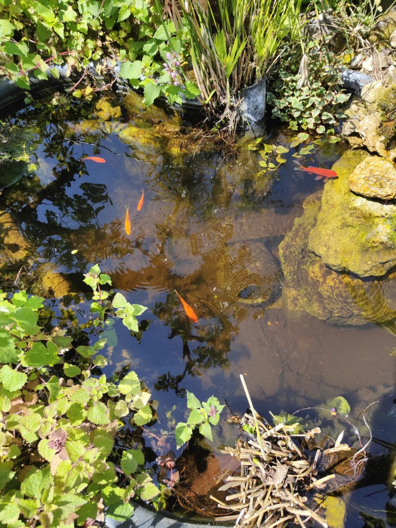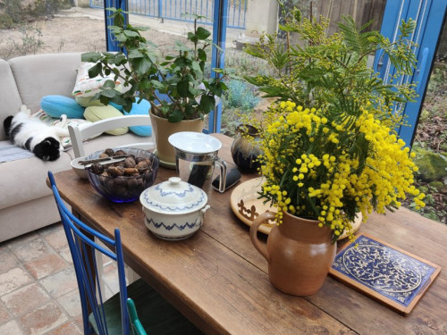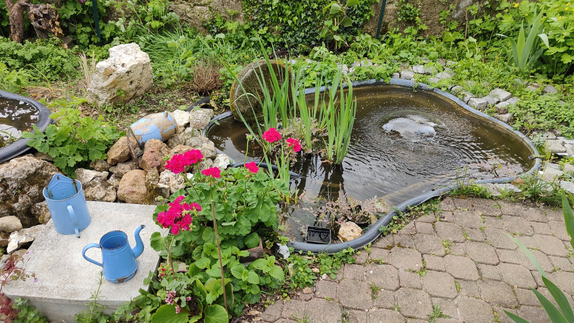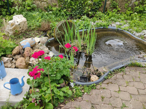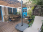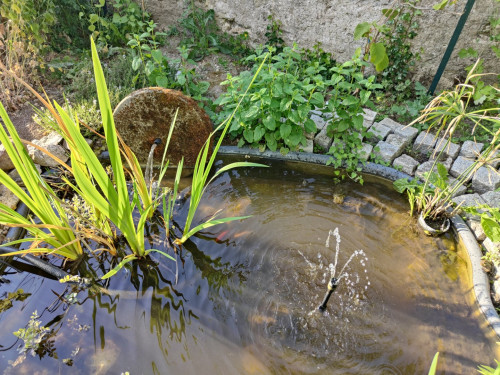 Canapé dans la véranda, ouvrant sur deux bassins extérieurs avec cascade et poissons. Terrasse ombragée sous un figuier. Terrasse ensoleillée avec parasol.