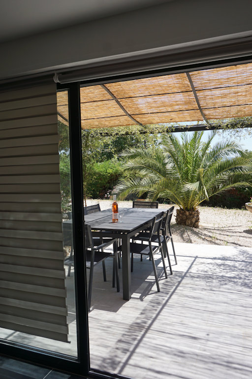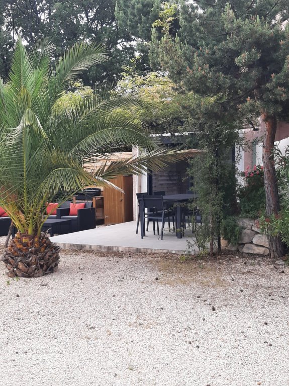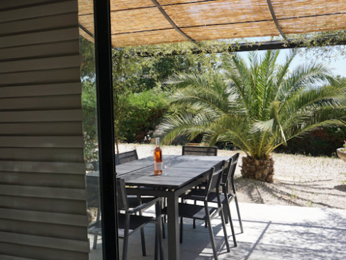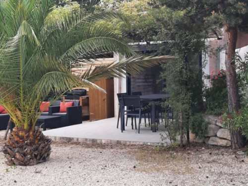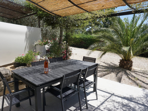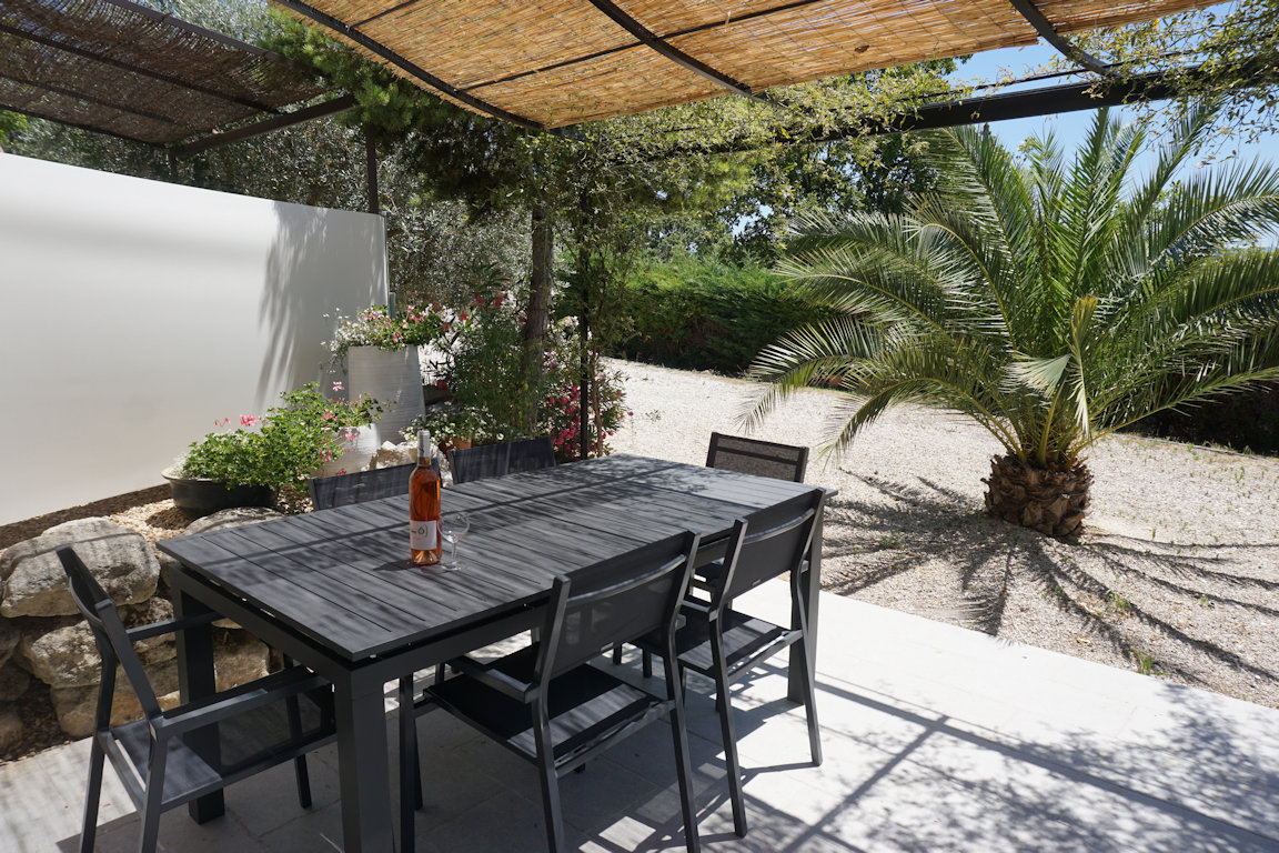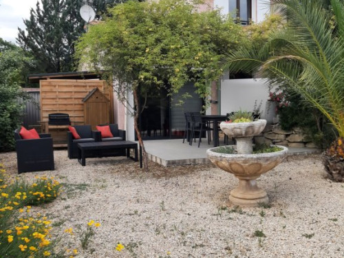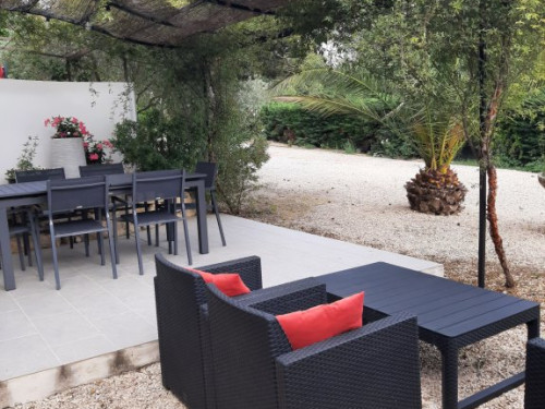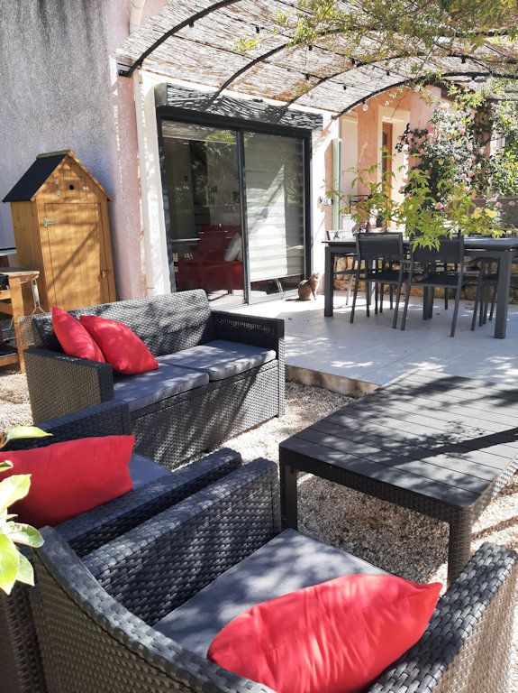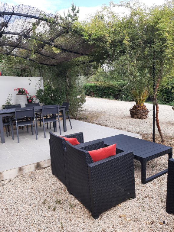 La terrasse est ombragée et aménagée avec barbecue et mobilier de jardin.