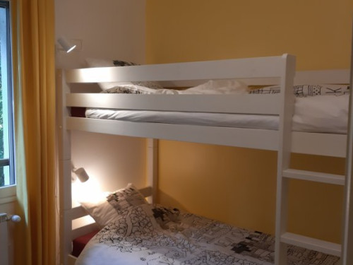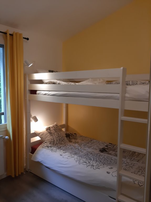 A l'étage, deux chambres, dont une avec lit double et l'autre avec lits superposés et lit bébé/enfant.
