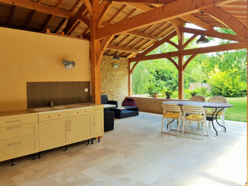 Quelques marches donnent accès à la véranda qui dessert la cuisine toute équipée (lave-linge, lave-vaisselle, four électrique, plaque induction, micro-ondes …) avec éléments encastrés, puis un salon avec deux canapés fixes, TV écran plat, du salon une porte donne accès à une terrasse puis au terrain à l'arrière de la maison et à la terrasse couverte de 60 m² avec salon extérieur.