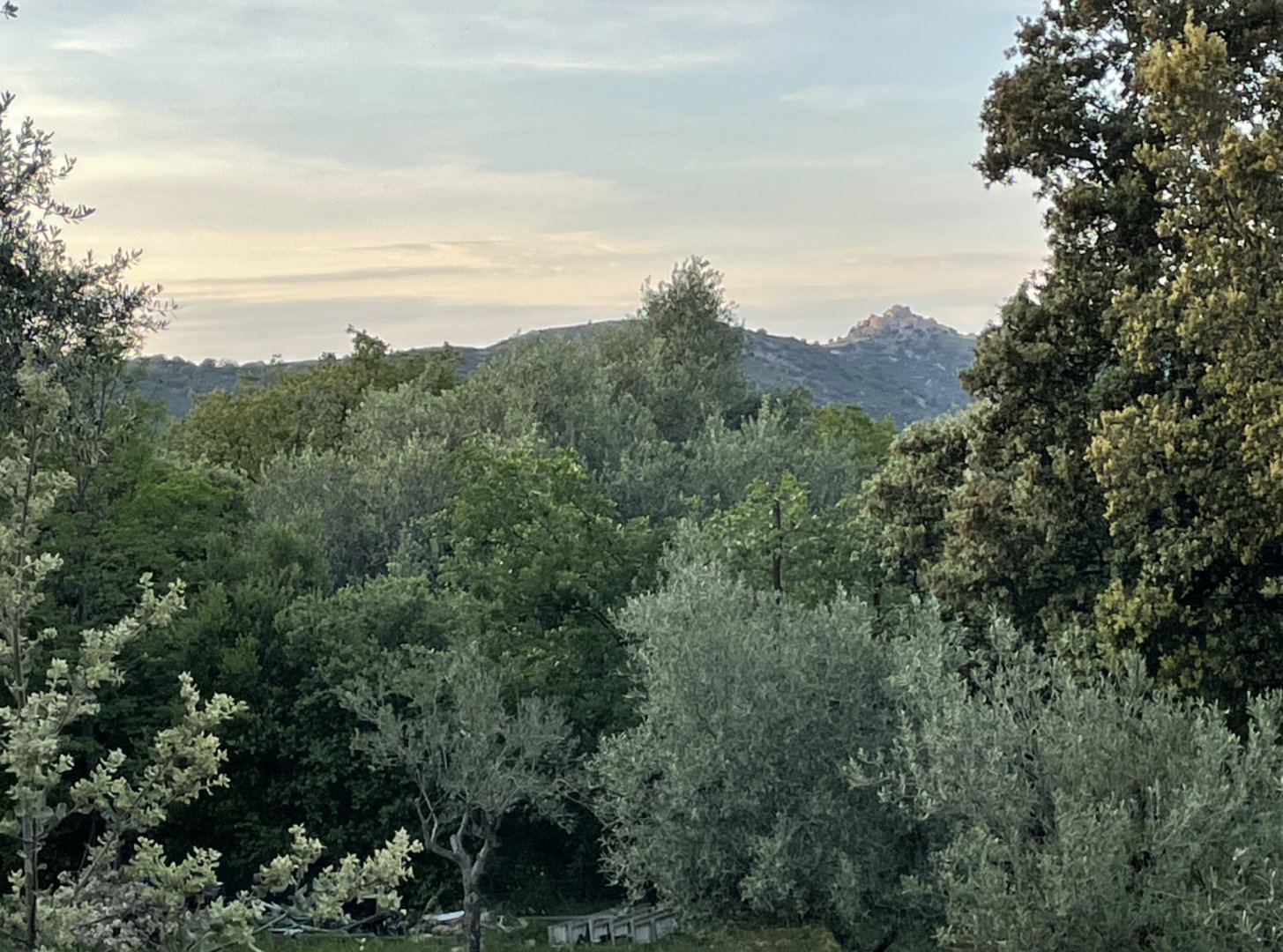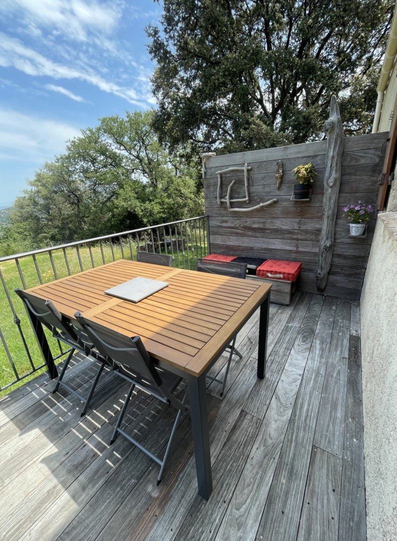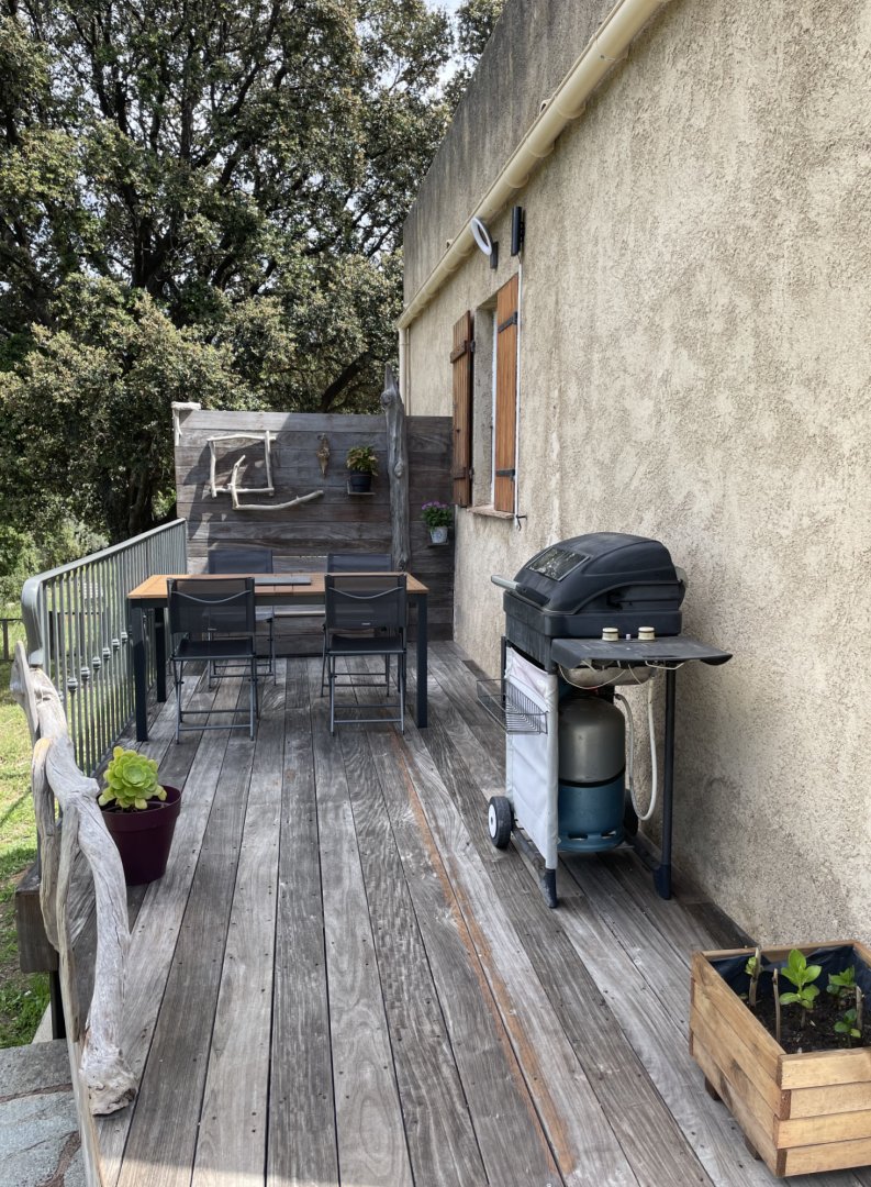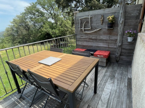 La terrasse bénéficie d'une table pour 4 à 6 personnes, barbecue à gaz, banc, accès terrain par escalier pierre pour relaxation sous les oliviers dans des transats.