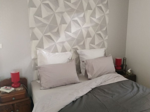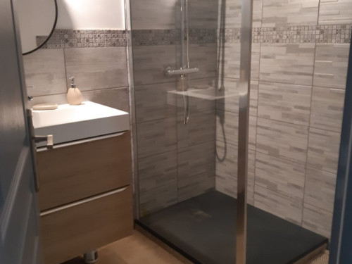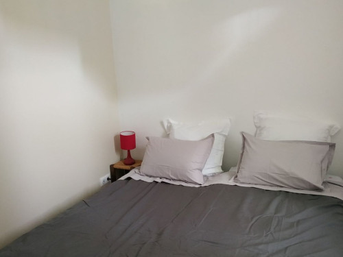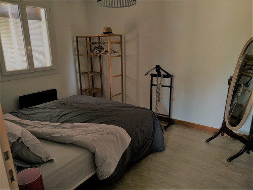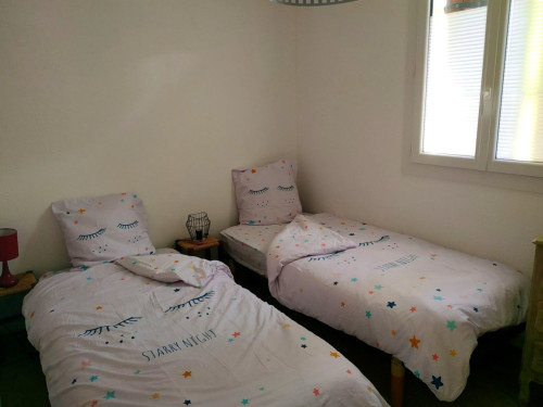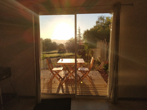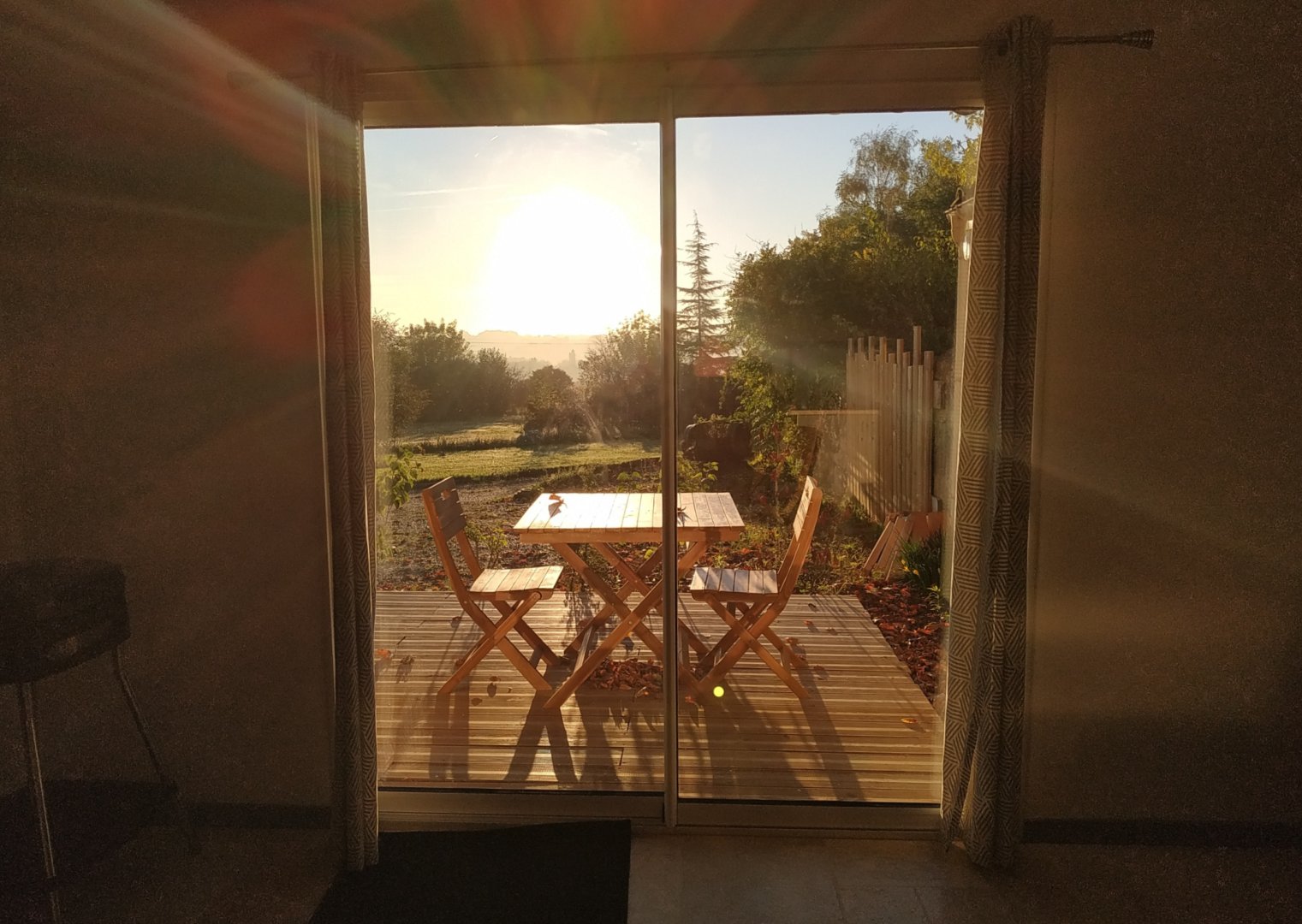 - l'entrée dans le logement se fait par la pièce à vivre : 1 cuisine avec salle à manger pour 2 personnes (max 4) et salon (1 TV) avec baie vitrée donnant sur le parc (très beau lever de soleil)