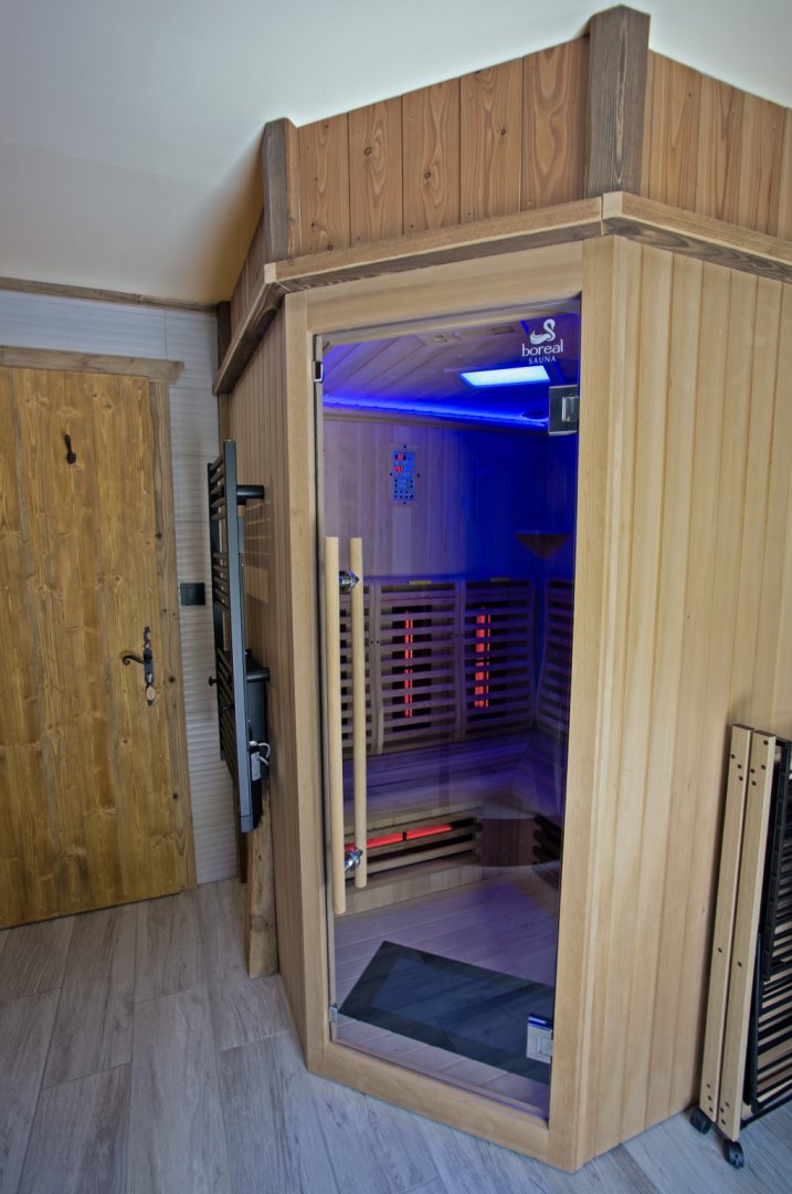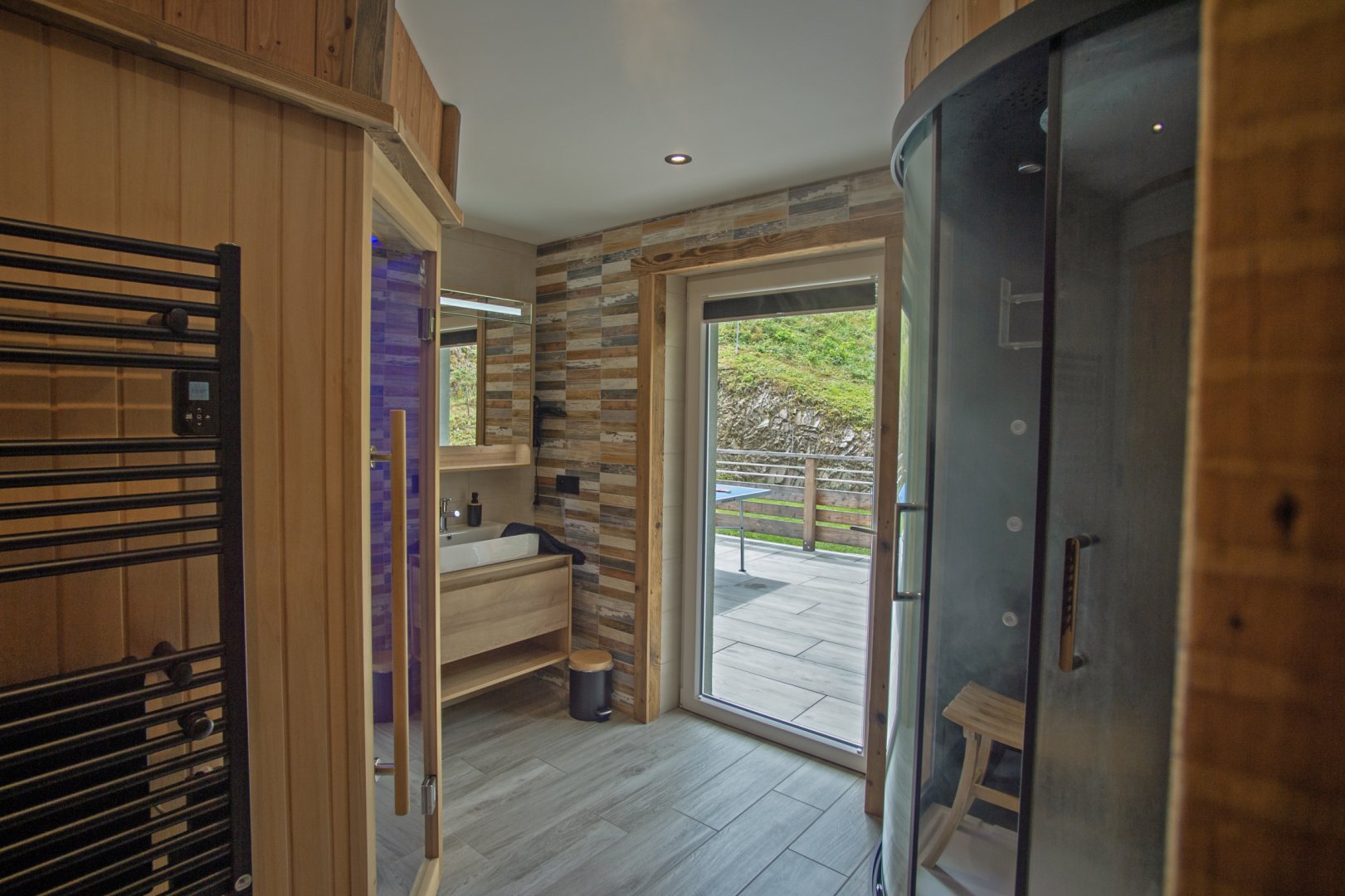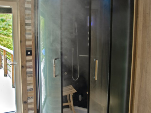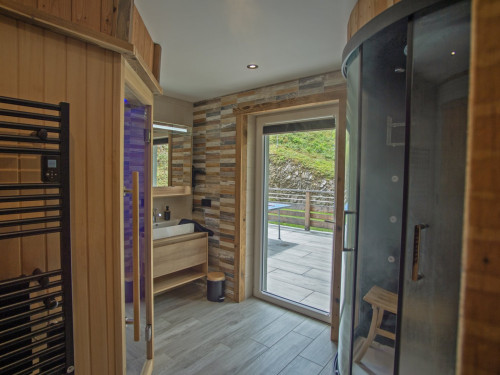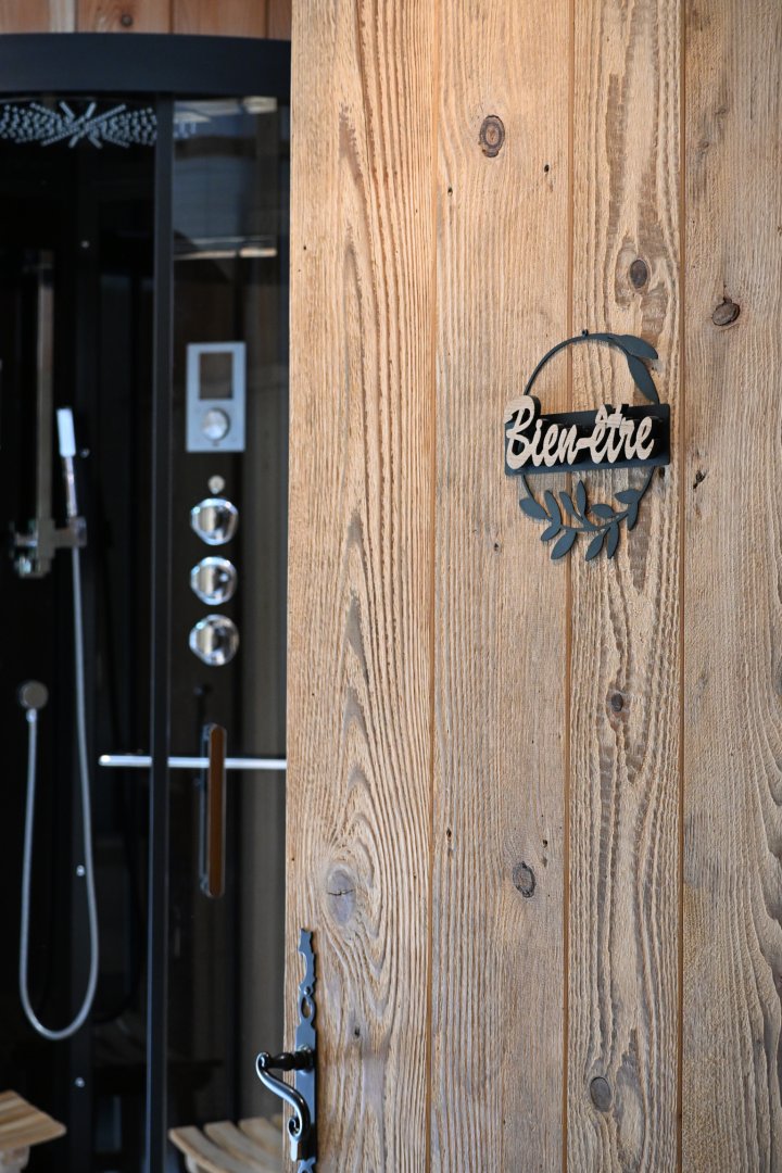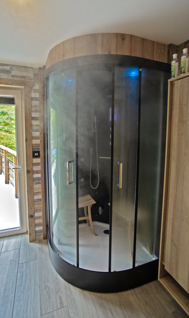 Vous serrez séduit par l'espace bien-être composé d'un sauna 4 places et d'une douche hammam 2 places pour des instants de détente en famille ou entre amis.