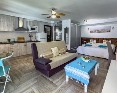 The apartment provides guests with a terrace, sea views, a seating area, cable flat-screen TV, a fully equipped kitchen with a microwave and a toaster, and a private bathroom with shower and a hair dryer. A fridge and kitchenware are also available, as well as a coffee machine and a kettle. At the apartment complex, every unit is equipped with bed linen and towels.