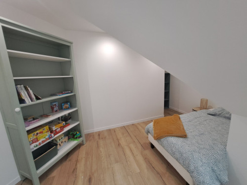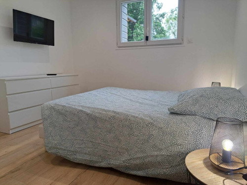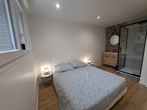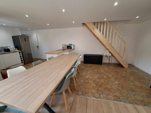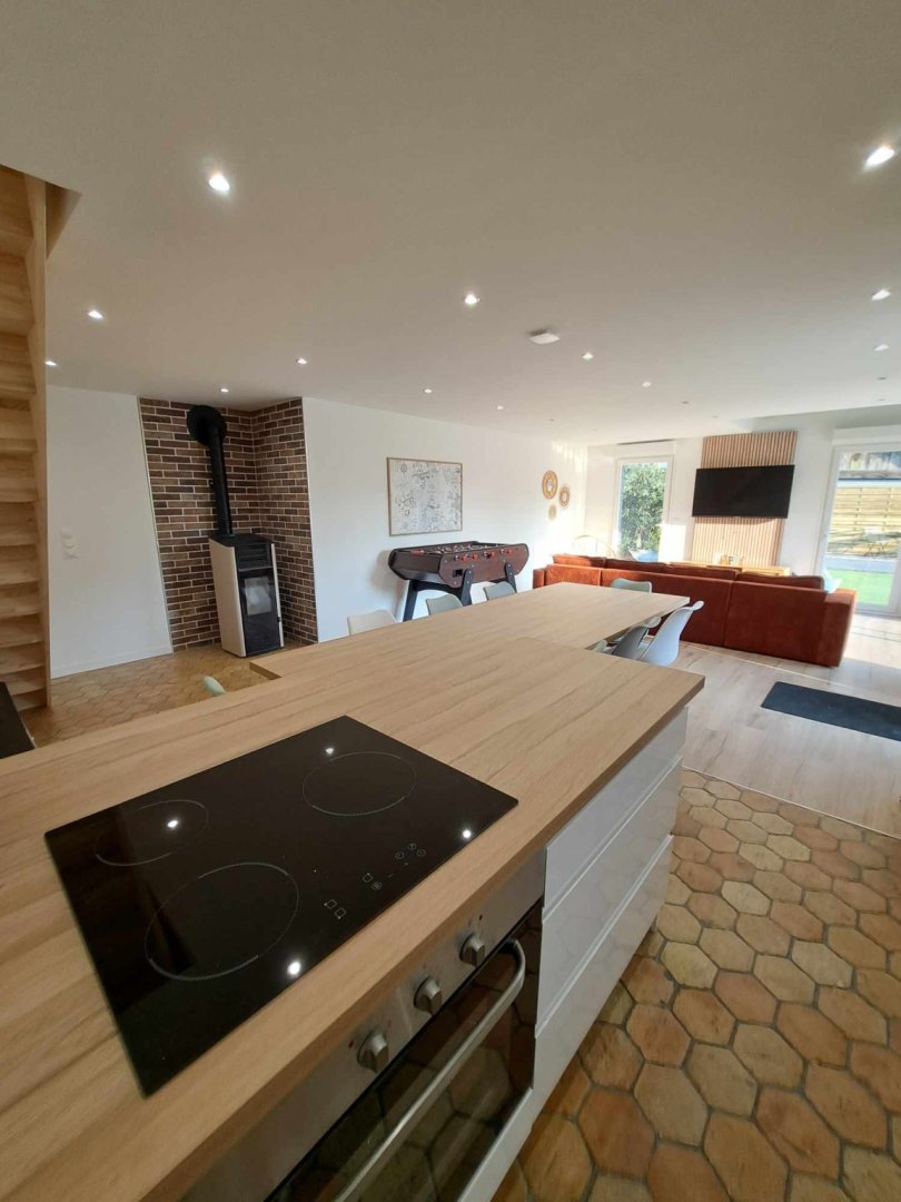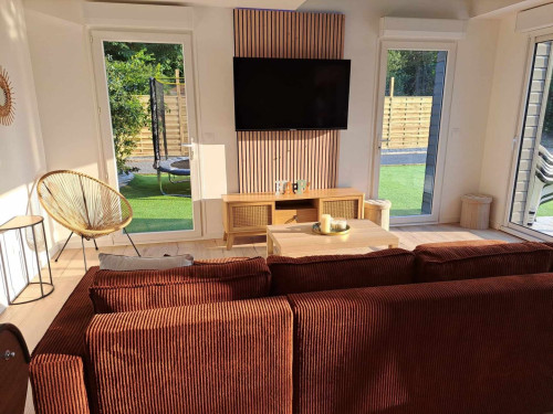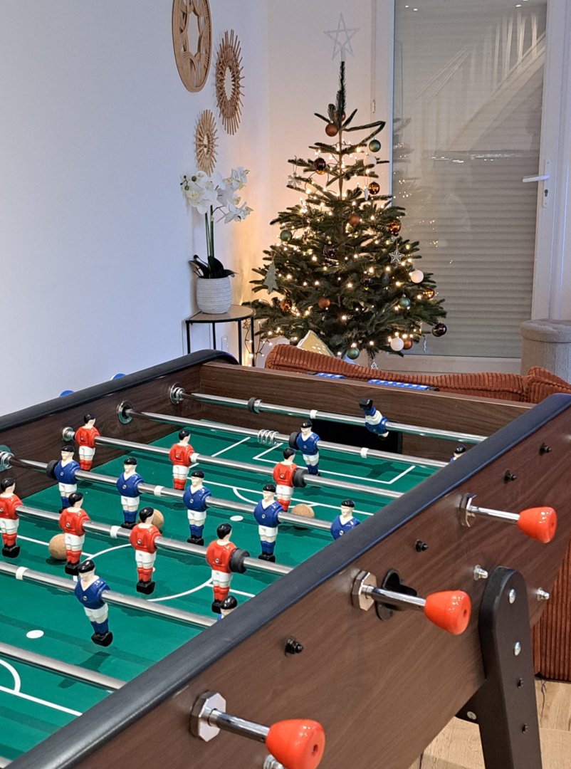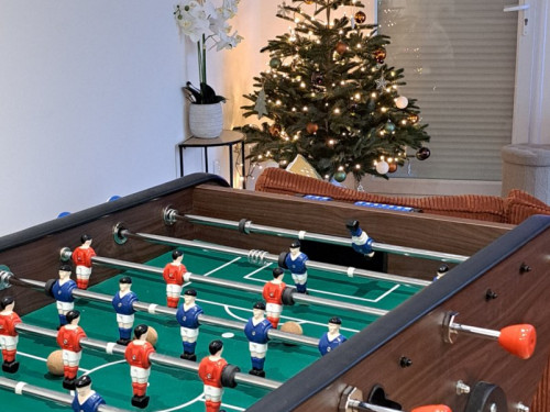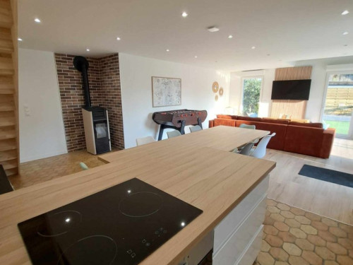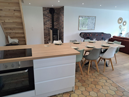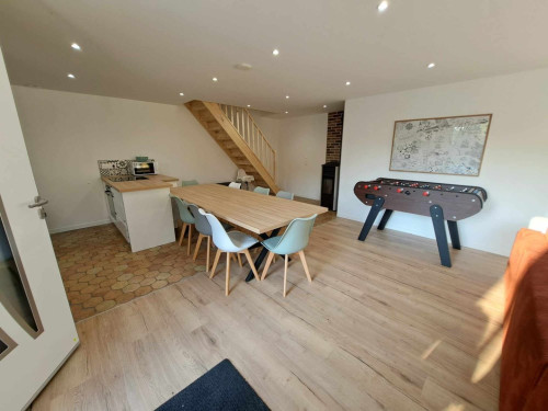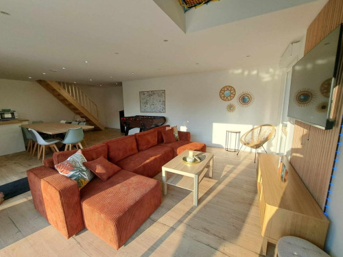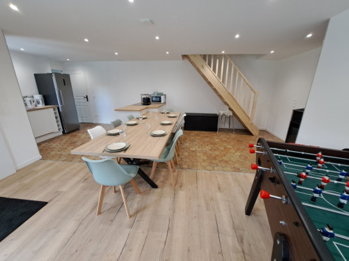 Pièce de vie ouverte, avec cuisine équipée, coin repas et espace salon (TV connecté à Netflix), ainsi que la mise a disposition d'un baby foot.