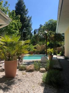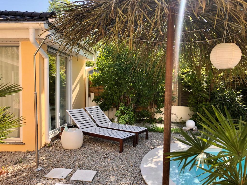 The holiday home features 1 bedroom, 1 bathroom, bed linen, towels, a flat-screen TV with satellite channels, a dining area, a fully equipped kitchenette, and a terrace with pool views. Guests can enjoy a meal on an outdoor dining area while overlooking the garden views. For added privacy, the accommodation has a private entrance and soundproofing.