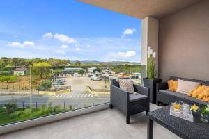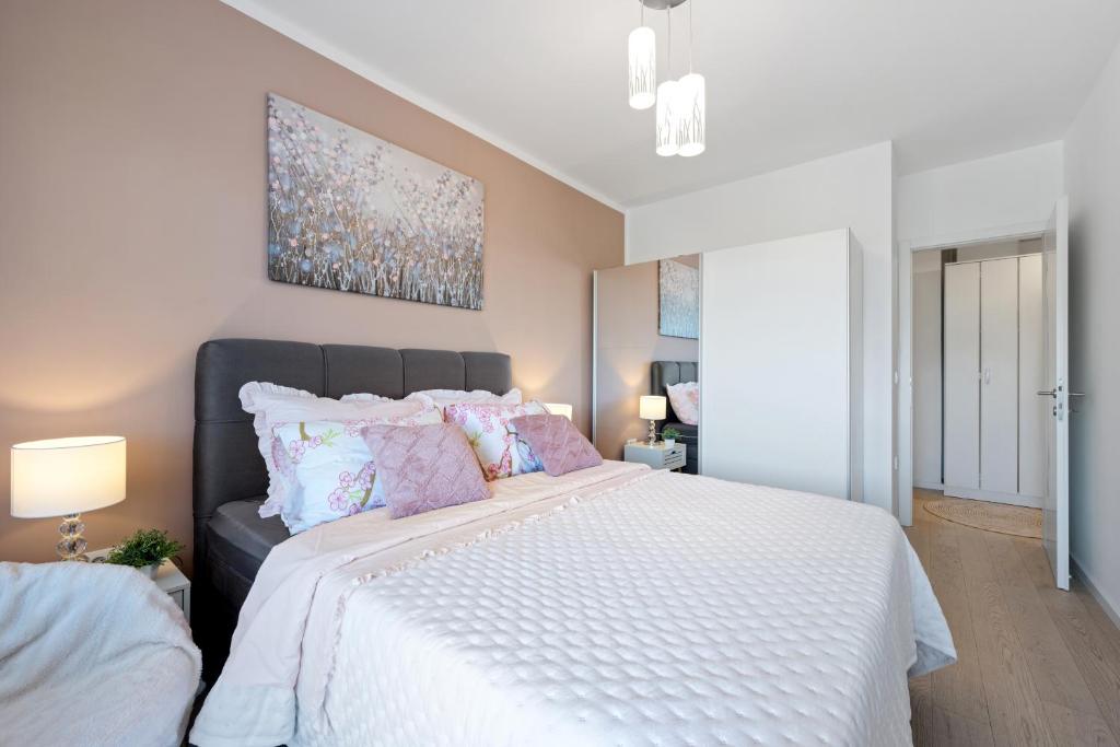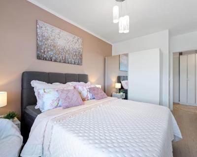 The apartment provides guests with a balcony, sea views, a seating area, satellite flat-screen TV, a fully equipped kitchen with a dishwasher and an oven, and a private bathroom with shower and a hair dryer. A toaster, a fridge and stovetop are also available, as well as a coffee machine and a kettle. At the apartment complex, every unit is fitted with bed linen and towels.