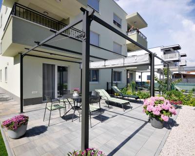 The apartment provides guests with a terrace, garden views, a seating area, satellite flat-screen TV, a fully equipped kitchen with a dishwasher and an oven, and a private bathroom with walk-in shower and a hair dryer. A microwave, a toaster and fridge are also featured, as well as a coffee machine and a kettle. At the apartment complex, the units have bed linen and towels.