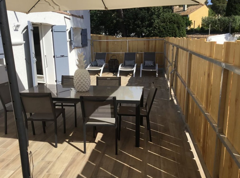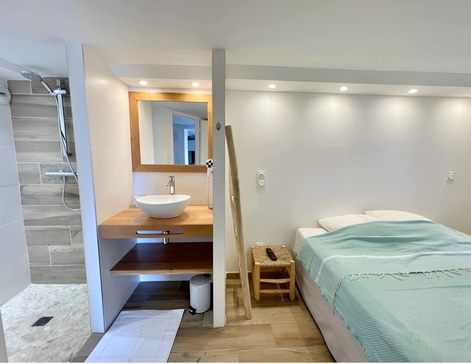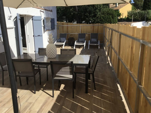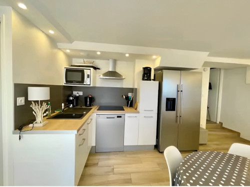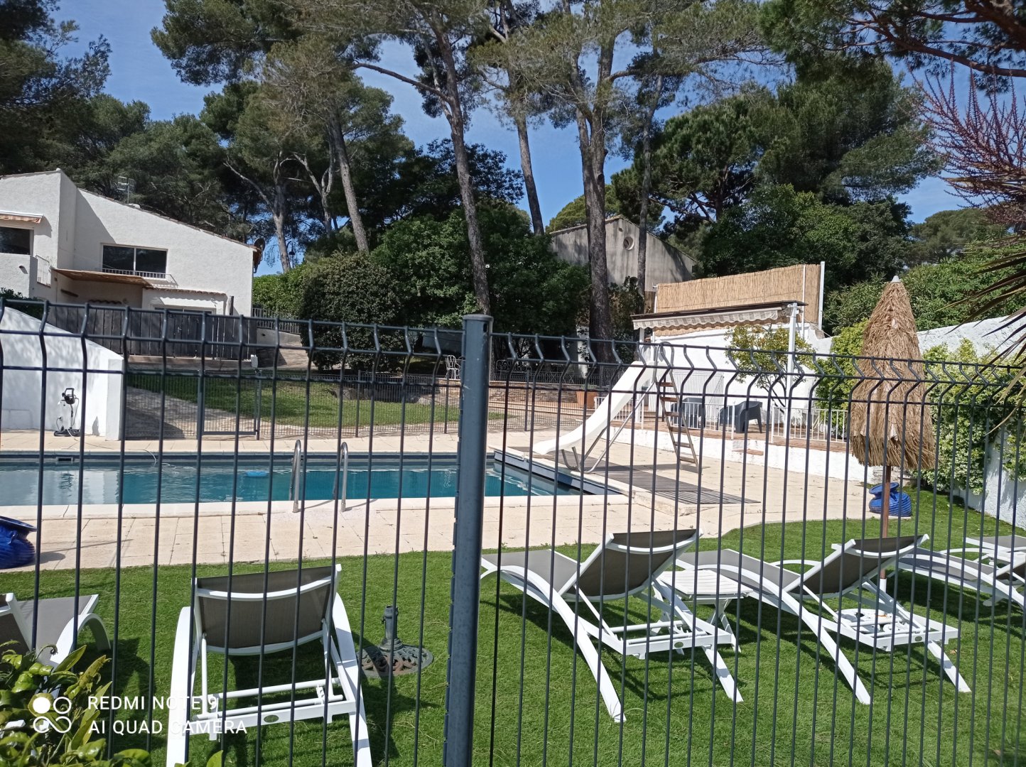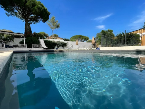 Appartement T3 rez de jardin climatisé en totalité , d'une cuisine équipée, plaque induction, frigo-américain, four/micro-ondes, est composé de 2 chambres lit 160/14 avec salle de bains privative, wc suspendu indépendant, canapé dans séjour donnant sur la terrasse de 60 m² fermée par un portillon vue sur la piscine, salon de jardin et bains de soleil, avec piscine 14 X 5 fermée par un portillon et clôturée.