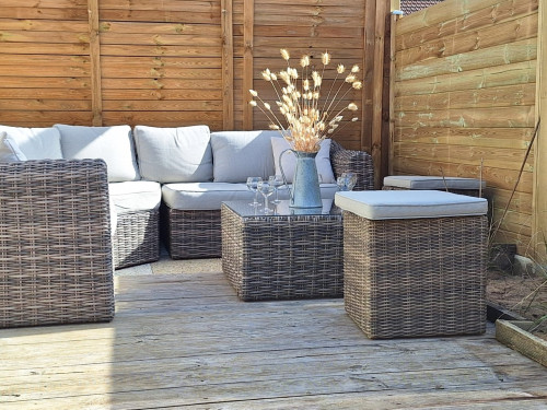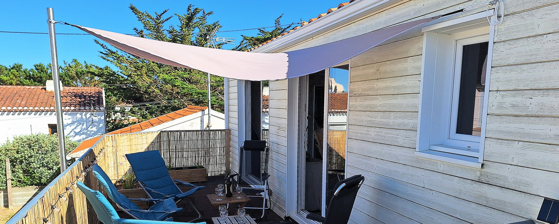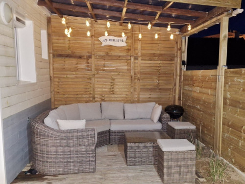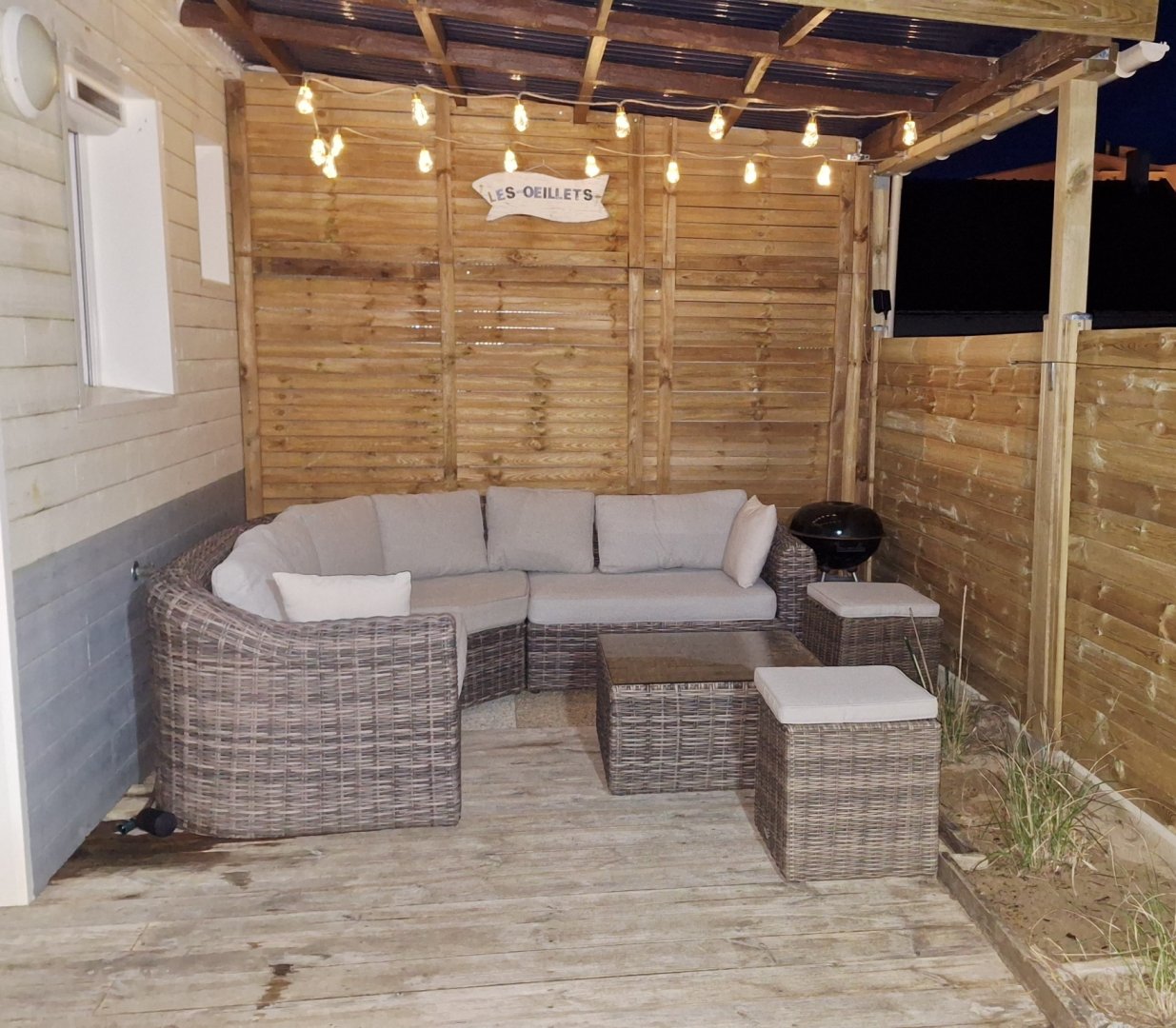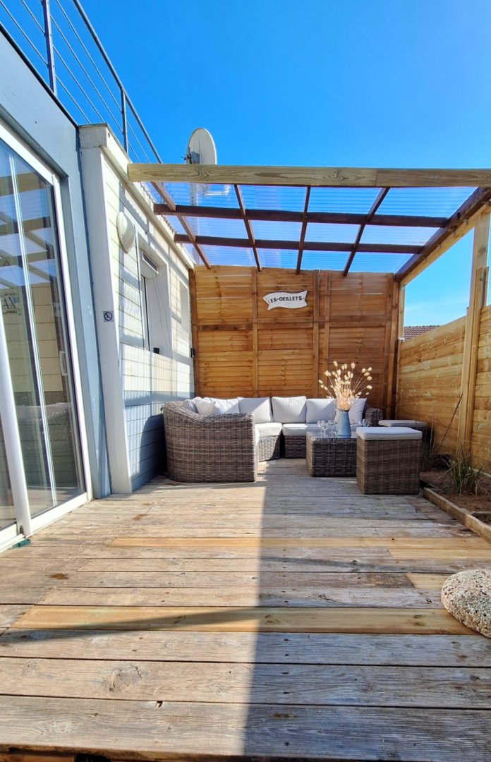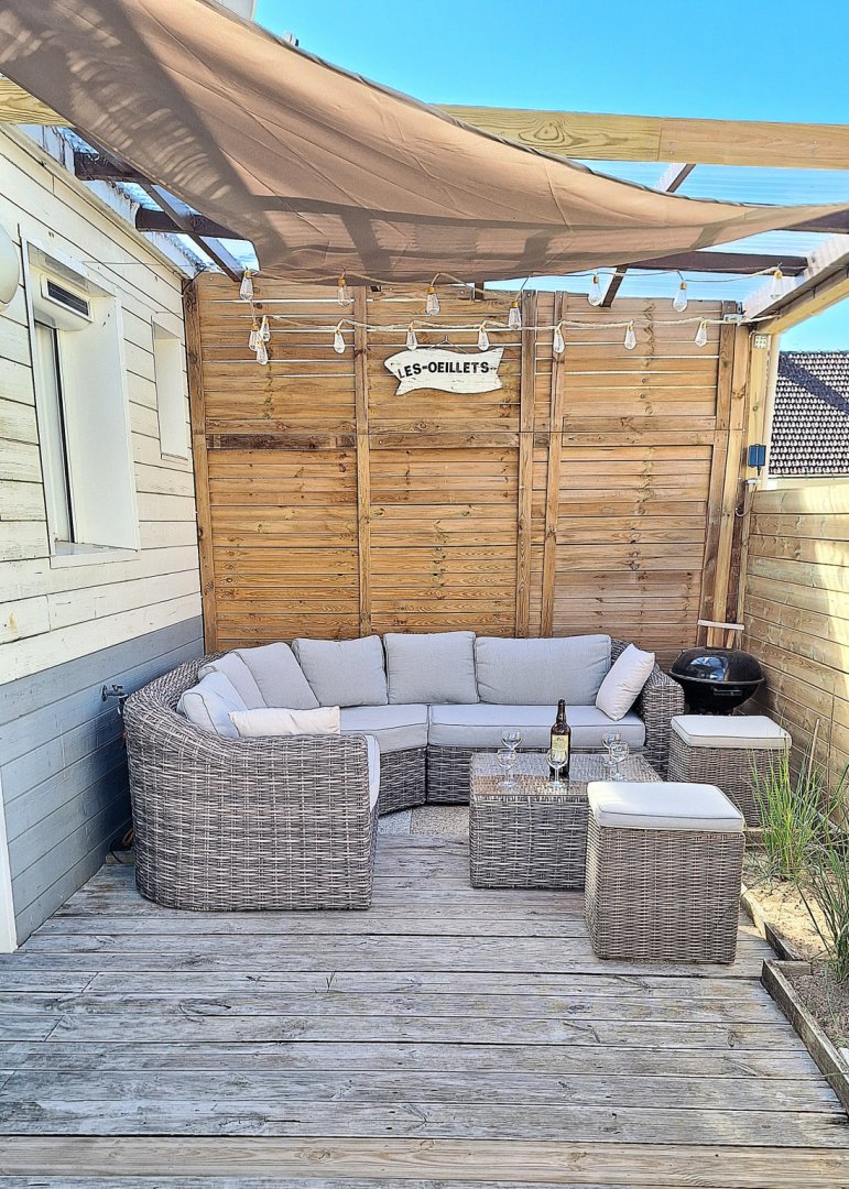 - 2 terrasses de 20 m² : barbecue, salon de jardin, tables basses, voile d’ombrage, 6 transats, 3 parasols
