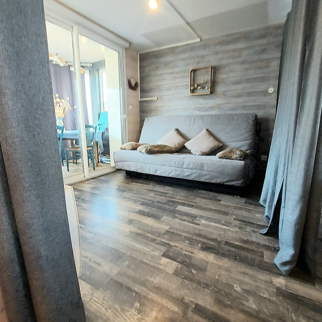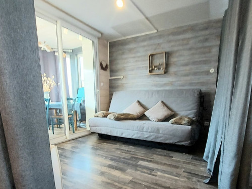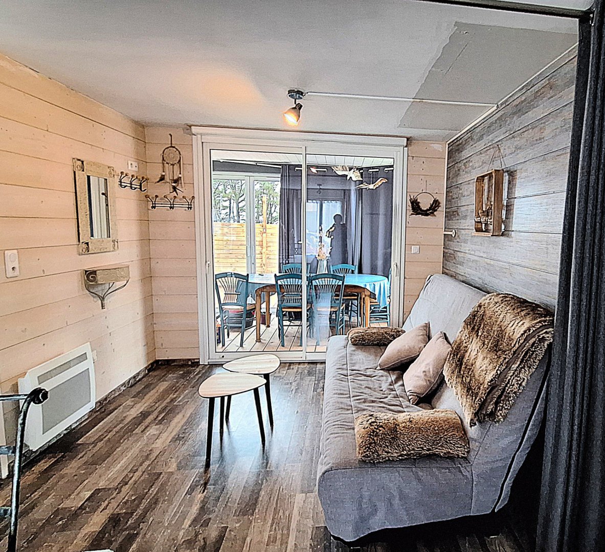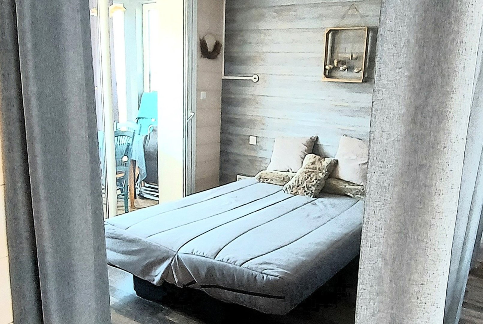 - un espace nuit dans le grand salon/séjour avec son clic-clac en 140. Il peut se fermer grâce aux rideaux afin de préserver votre intimité, 1 second canapé, table basse, poufs, télévision (pas de WiFi)