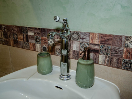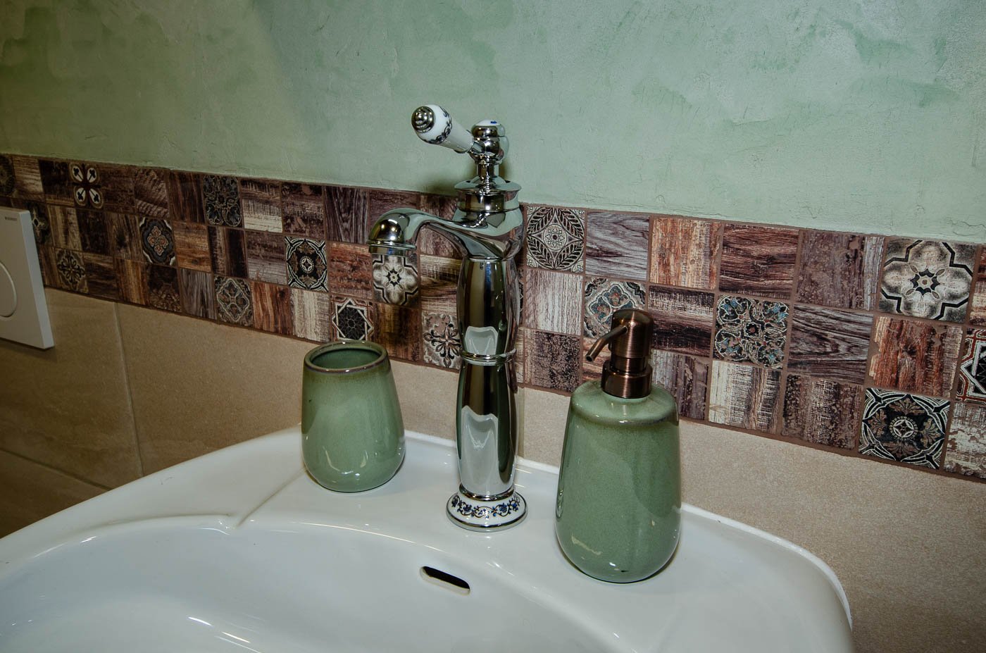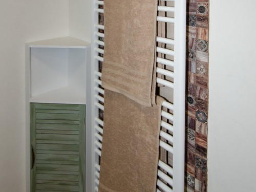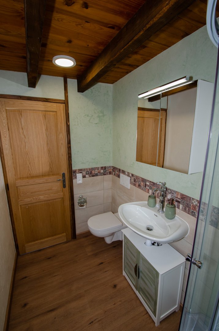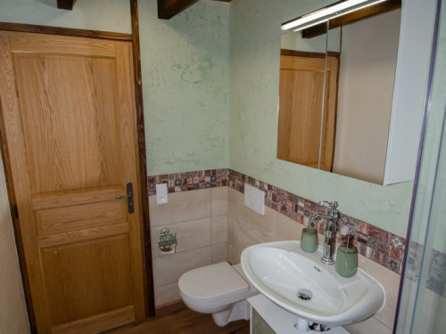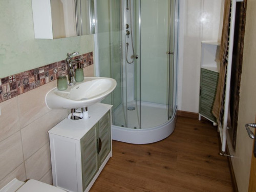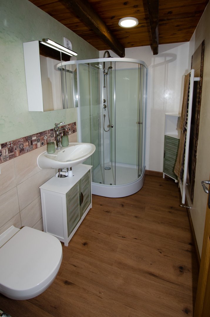 - salle de bain avec douche, toilettes, lavabo, sèche-cheveux