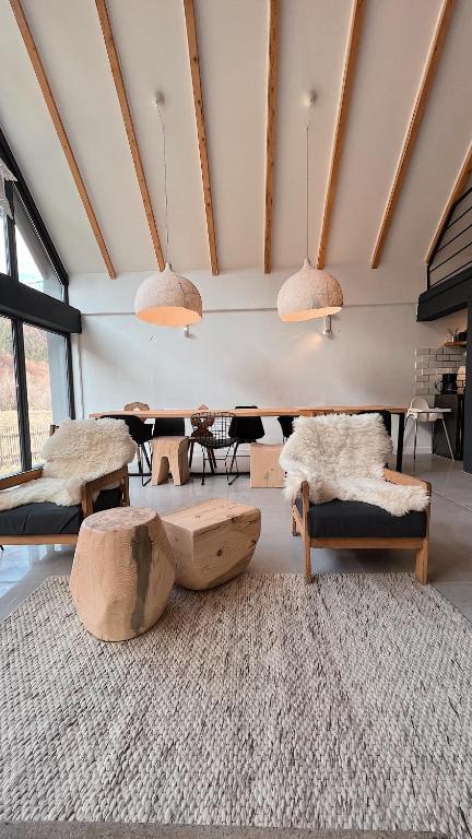 The holiday home consists of 4 bedrooms, a living room, a fully equipped kitchen with a microwave and a coffee machine, and 3 bathrooms with a shower and slippers. There is also a seating area and a fireplace.