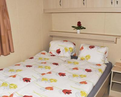 A modern mobile home with a veranda featuring a living room with an equipped kitchenette, a bathroom with shower and toilet, and beds with woollen blankets and pillows. Bedding, towels and crockery are provided.