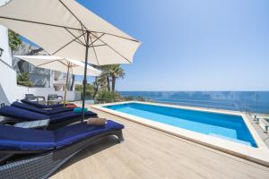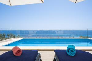 The spacious chalet features 3 bedrooms, 2 bathrooms, bed linen, towels, a TV with satellite channels, a fully equipped kitchen, and a terrace with sea views. The property offers pool views.