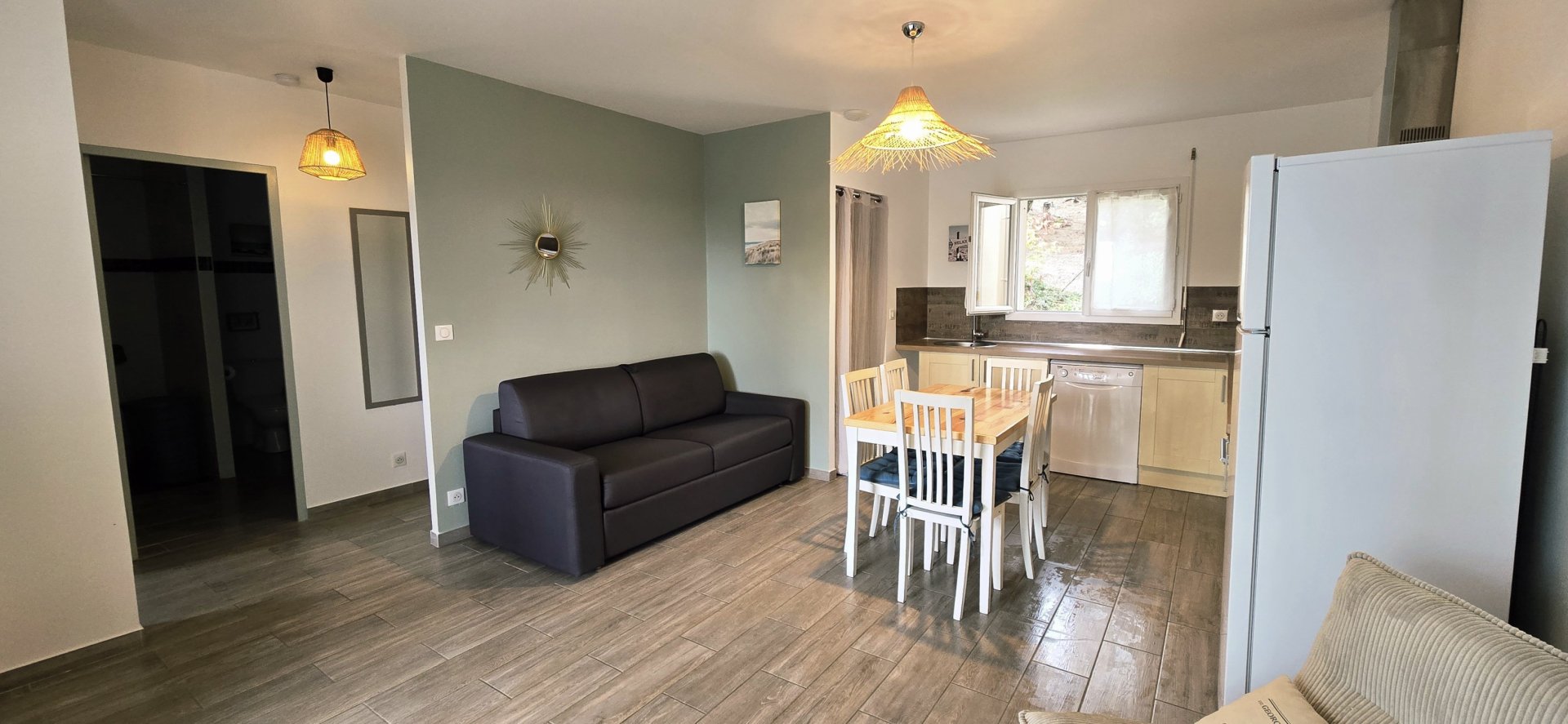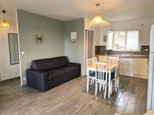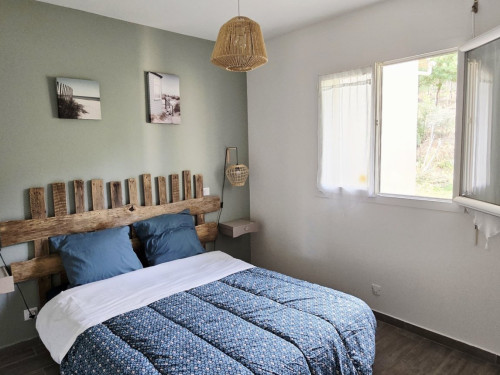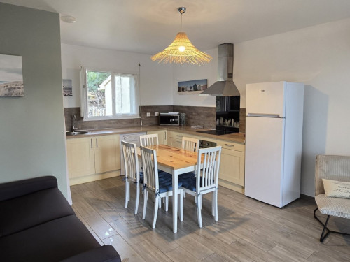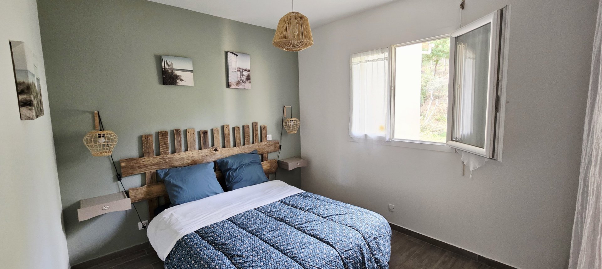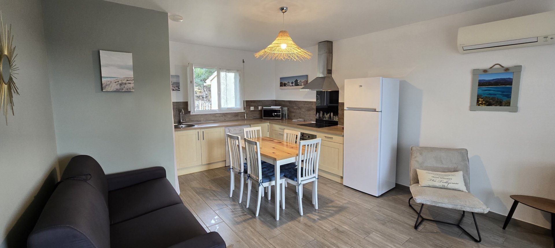 La location est composée de 2 chambres lits doubles et un canapé-lit dans le salon, une belle pièce de vie avec cuisine ouverte, une douche à l'italienne, climatisation, lave-vaisselle, lave-linge, barbecue, TV, WiFi, belle terrasse vue dégagée