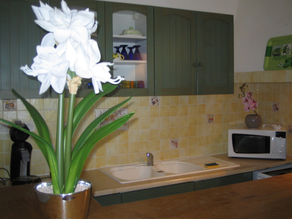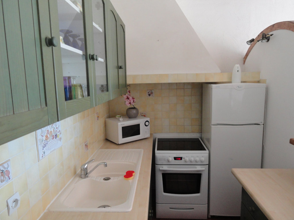 Cuisine équipée avec gazinière électrique, plaques vitrocéramiques, frigo-congélateur, micro-ondes, lave-linge...