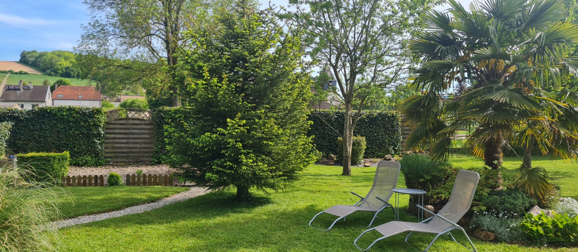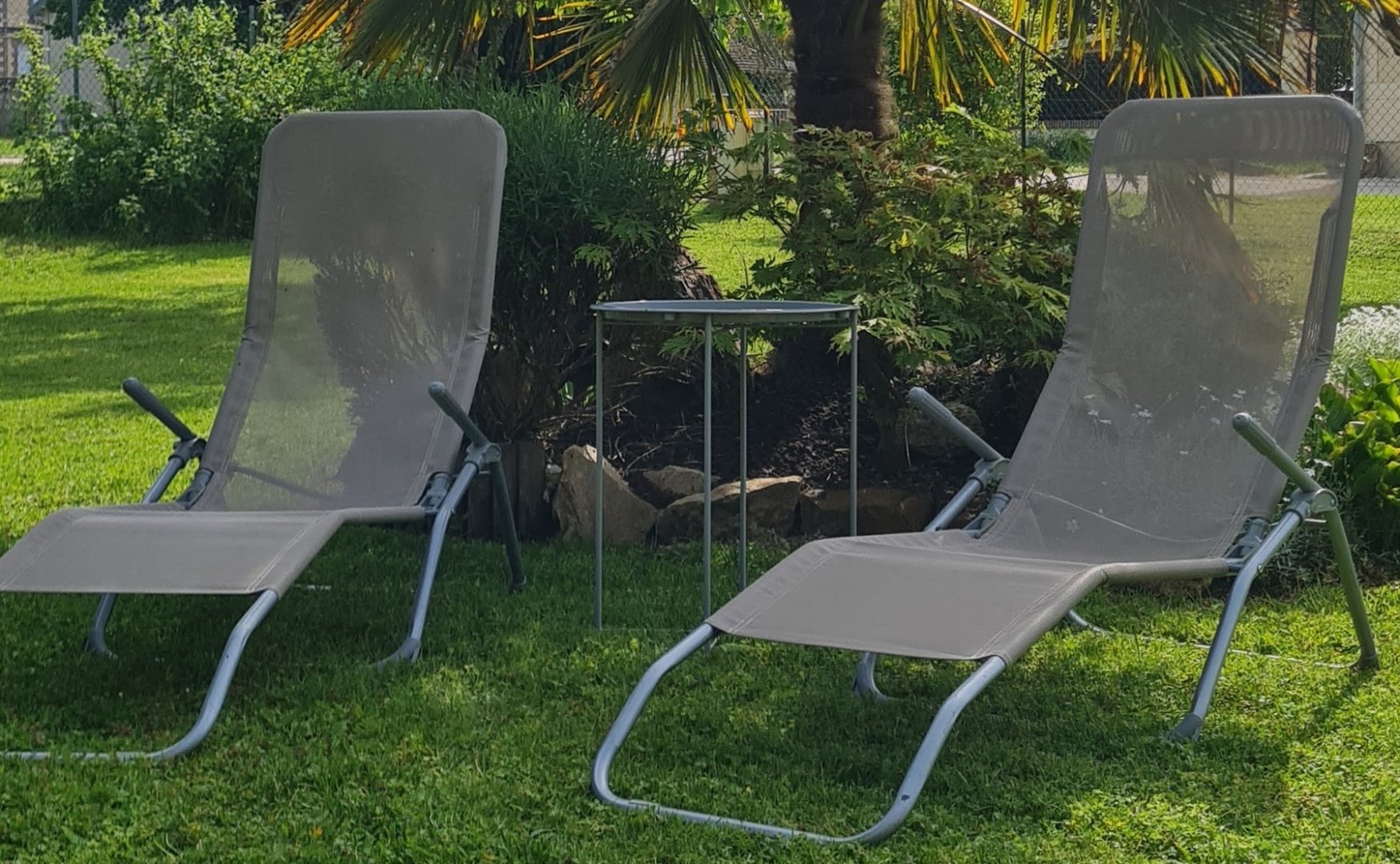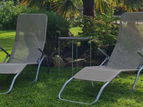 À l'extérieur : vous aurez un très joli jardin clos de 800 m² dans lequel vous pourrez vous reposer au soleil ou à l'ombre des arbres dans les transats.