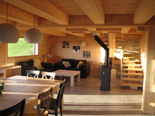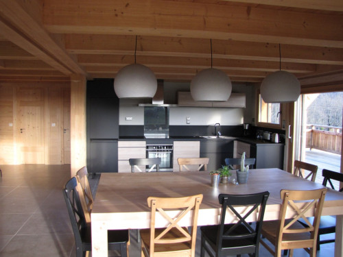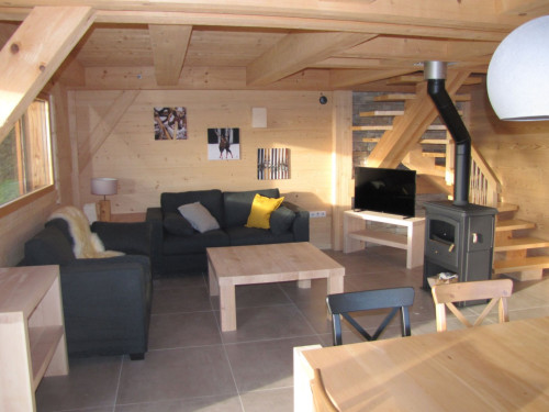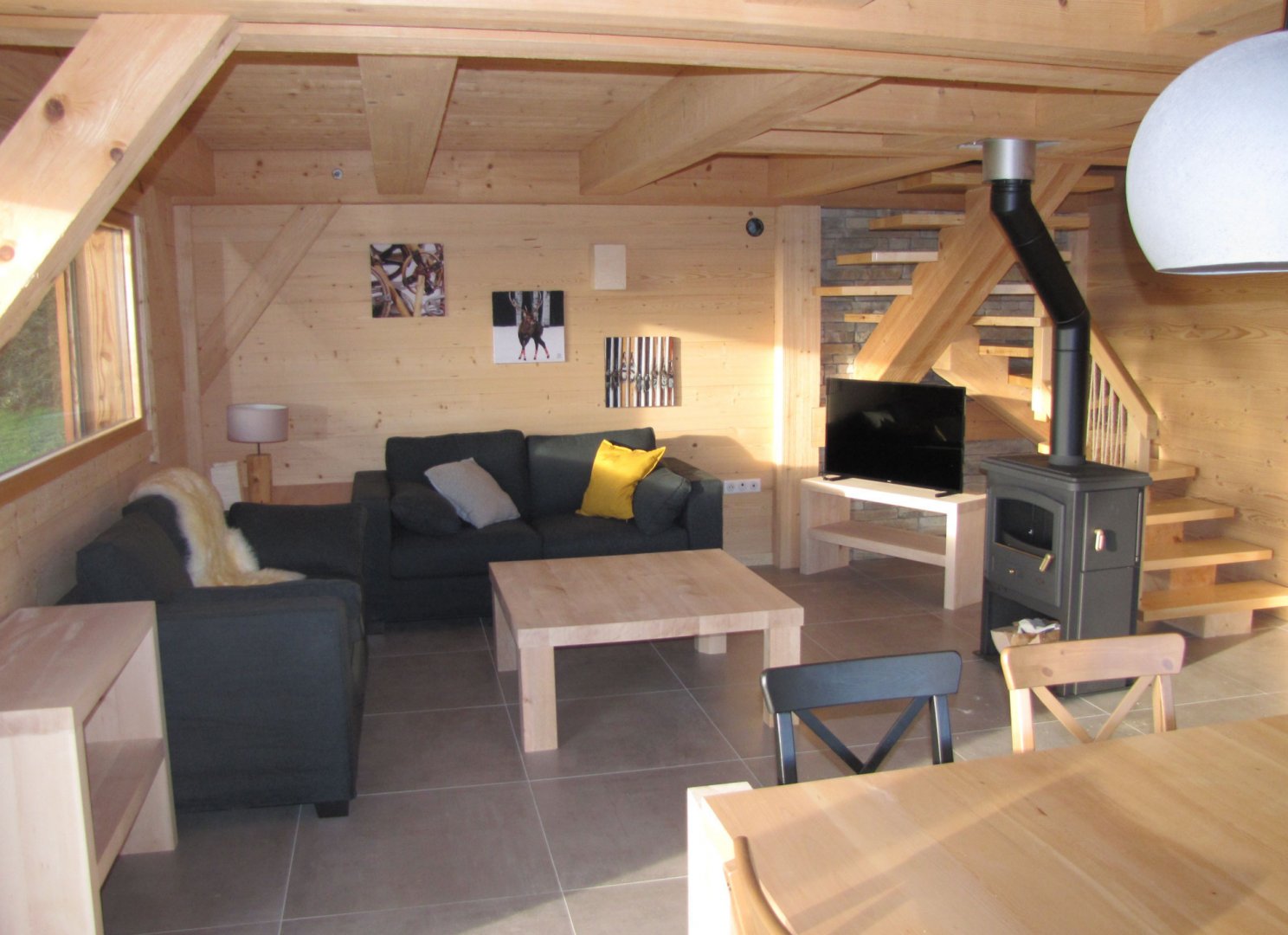 Au rez-de-chaussée : grande pièce à vivre avec cuisine entièrement équipée et espace salon avec canapé et télévision écran plat et poêle à bois (le bois est fourni).