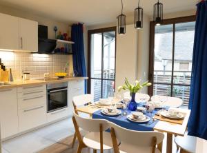 Cet appartement comprend un balcon, 2 chambres, un salon, ainsi qu’une cuisine bien équipée avec un réfrigérateur et un lave-vaisselle.