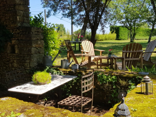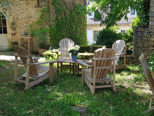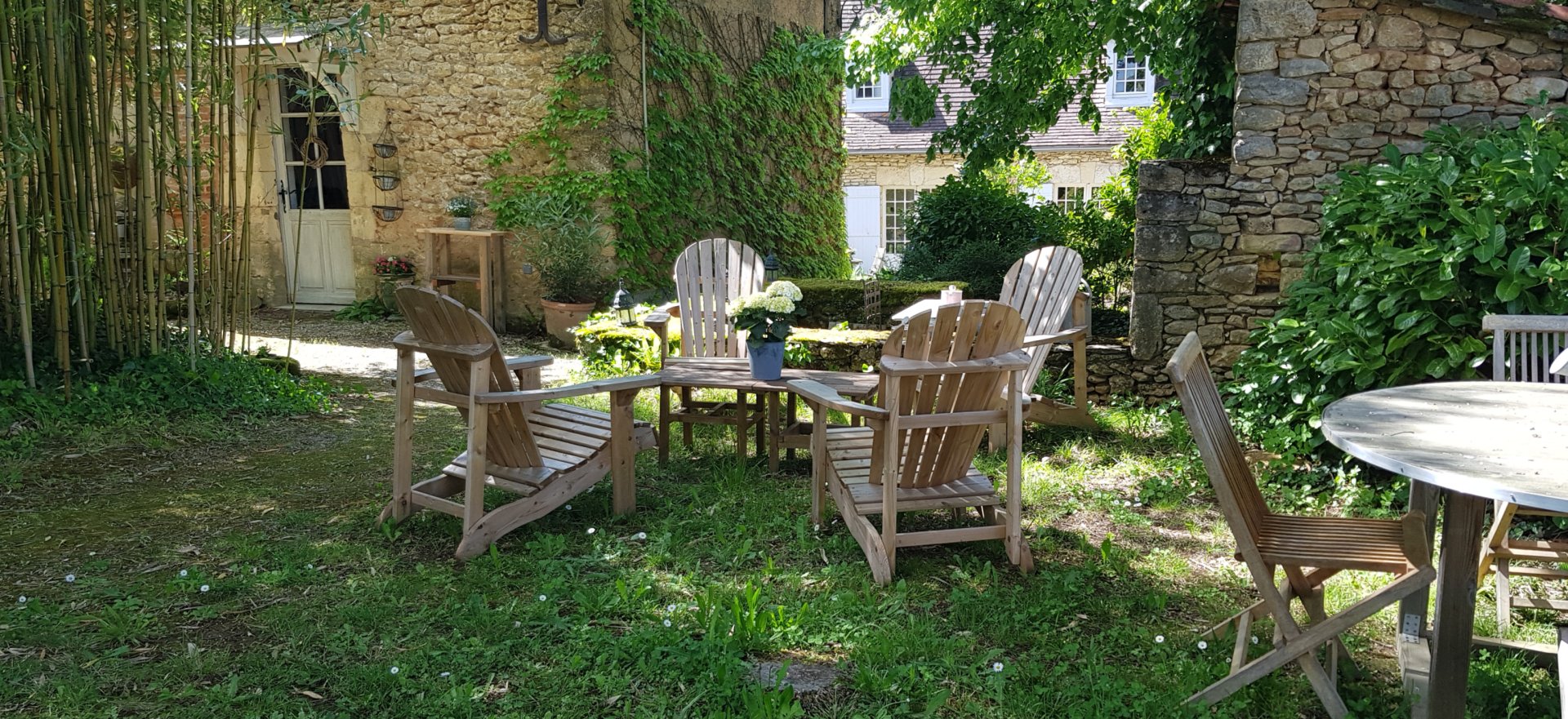 Vous disposez d’un salon de jardin avec fauteuils, tables et chaises.