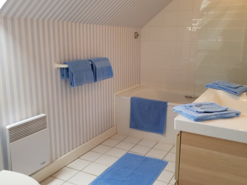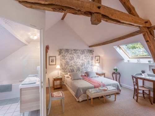 À l’étage, deux chambres climatisées de 25 m² bénéficient d’une grande literie en 180x200 ou à la demande de lits jumeaux. Chacune dispose d’une salle de bains avec toilettes.