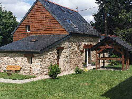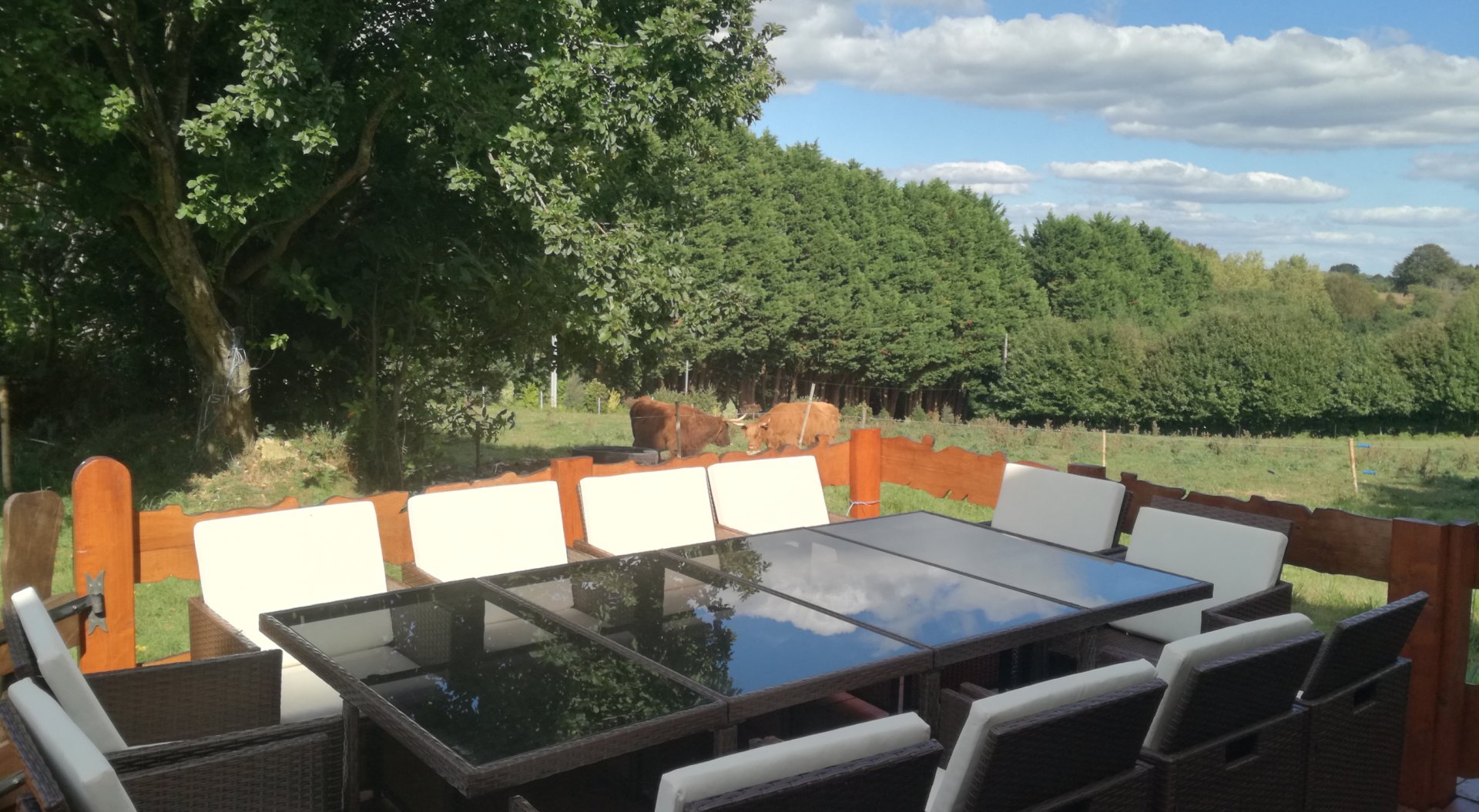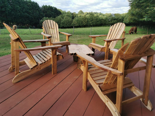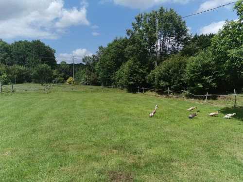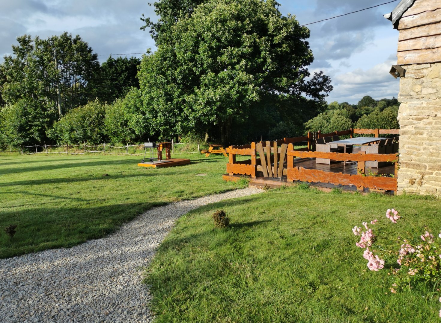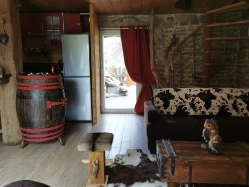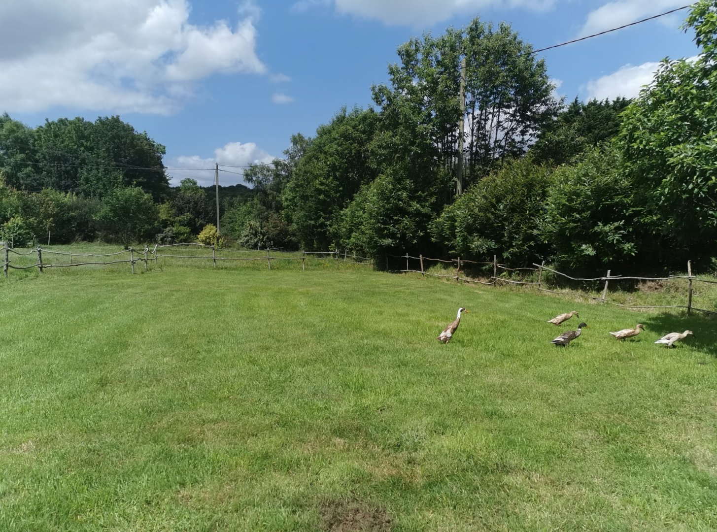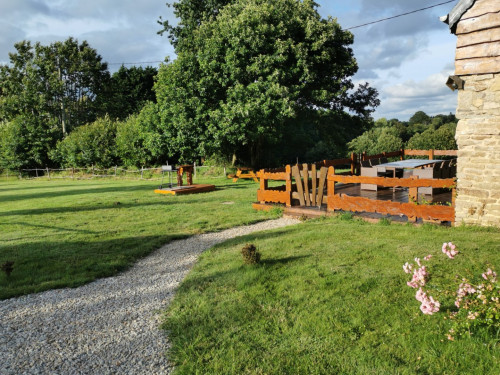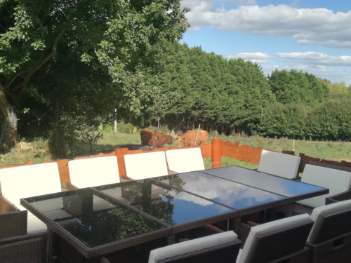 1 cuisine bien équipée, un salon avec accès sur une terrasse de 40 m² sans vis-à-vis et vue sur le pré des chevaux, une seconde terrasse avec vue sur le champs des vaches, un jardin privatif de 600 m², un grand parking privé, un kiosque, un espace barbecue avec sa table pique-nique sous le pommier.