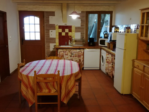 • cuisine équipée avec vaisselle complète, réfrigérateur avec compartiment freezer, cuisinière 4 plaques avec four, micro-ondes, cafetière et grille-pain