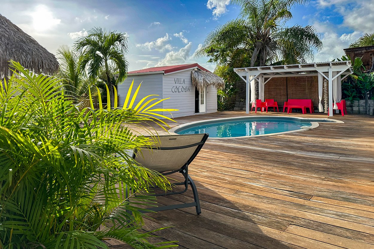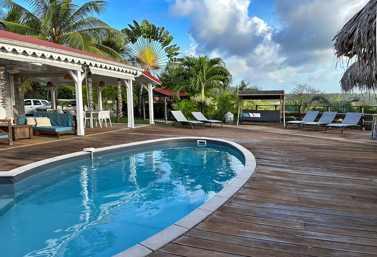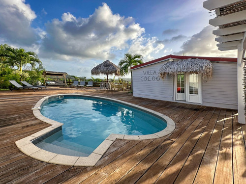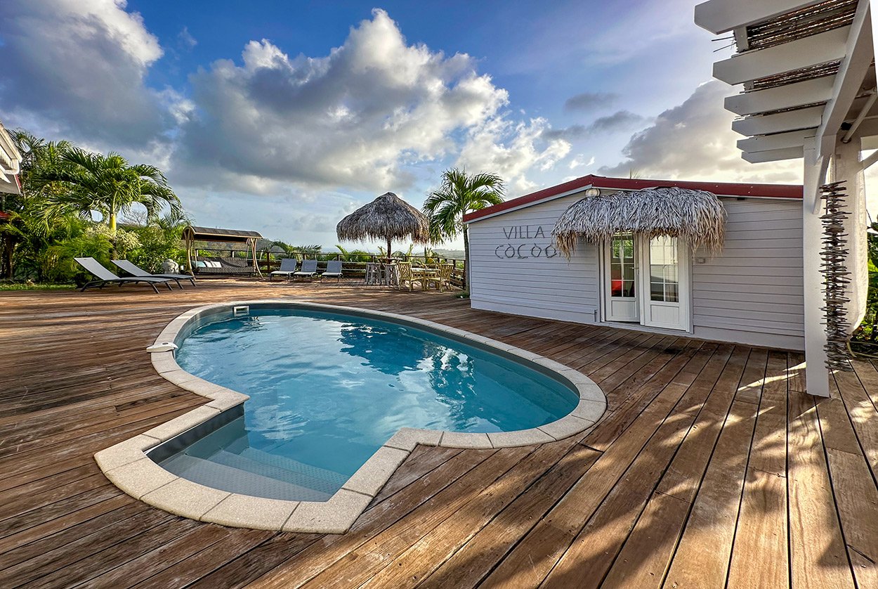 La Villa Cocoon offre une piscine privée au sel sans vis-à-vis de 7 x 3.50 m avec un immense deck en bois de 110 m² depuis lequel vous pourrez admirer l'incroyable vue à 180° sur la mer des Caraïbes, la célèbre 'femme couchée', le Rocher du Diamant et sur les plantations de canne à sucre de la rhumerie des Trois Rivières.