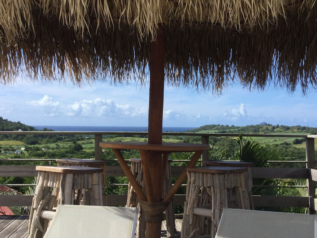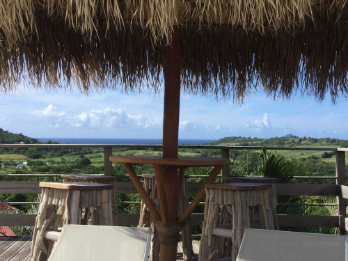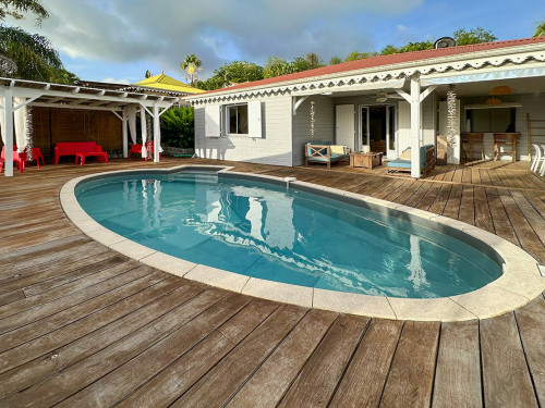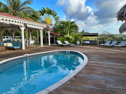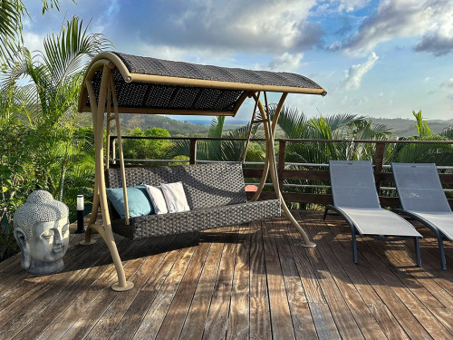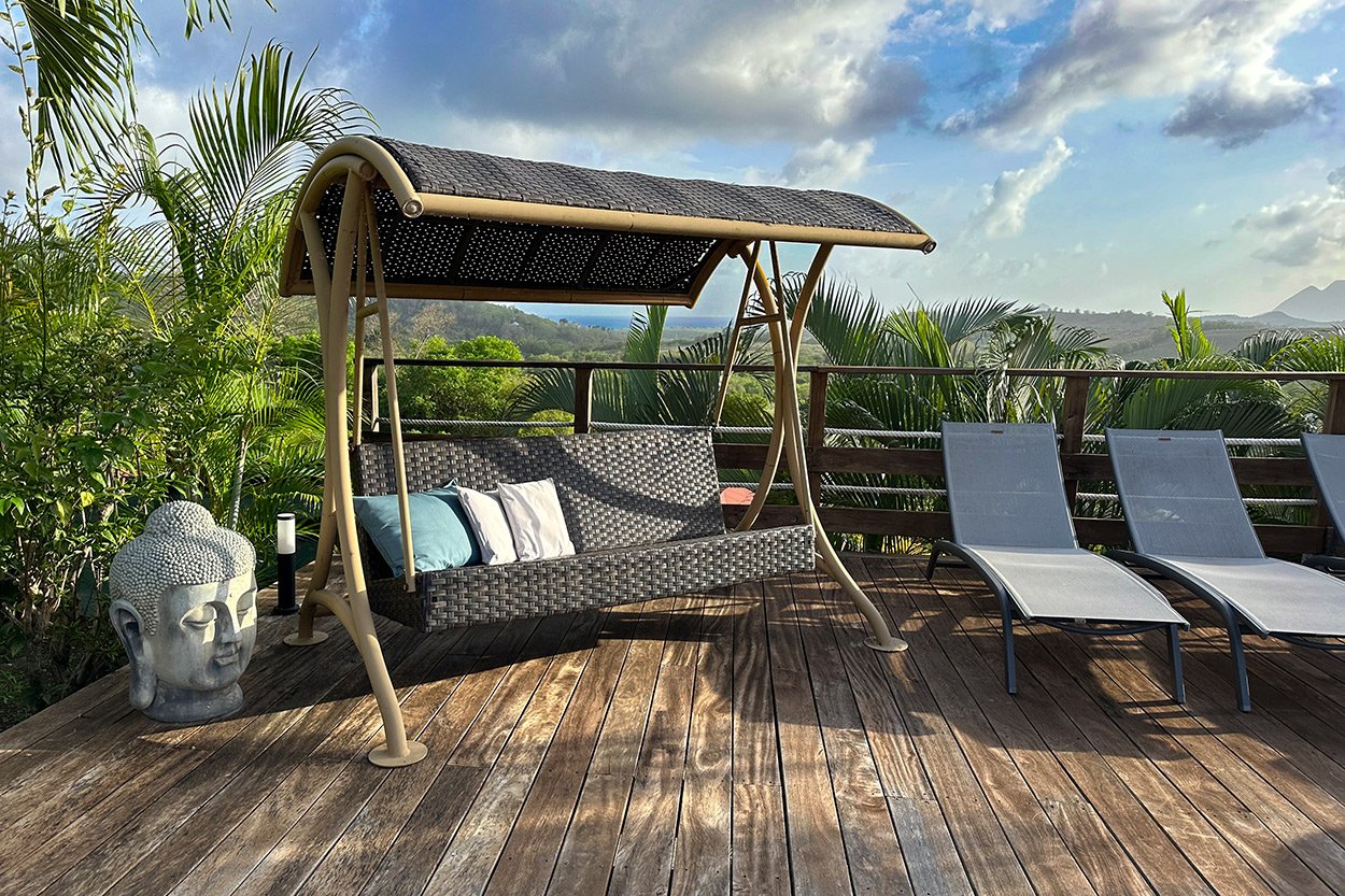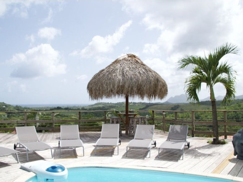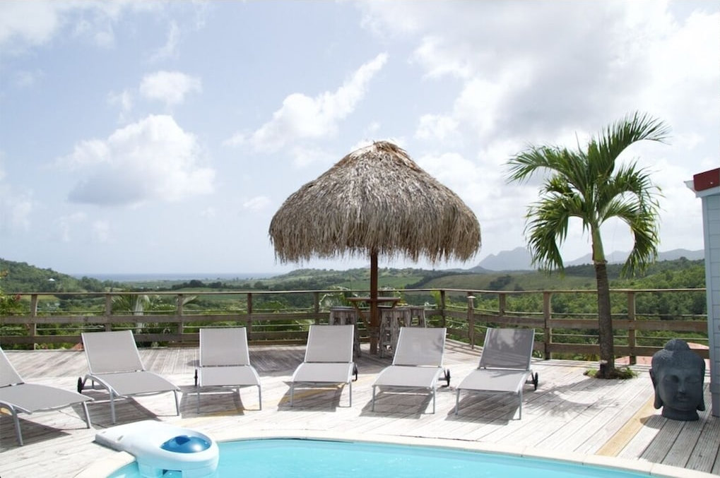 La Villa Cocoon offre une piscine privée au sel sans vis-à-vis de 7 x 3.50 m avec un immense deck en bois de 110 m² depuis lequel vous pourrez admirer l'incroyable vue à 180° sur la mer des Caraïbes, la célèbre 'femme couchée', le Rocher du Diamant et sur les plantations de canne à sucre de la rhumerie des Trois Rivières.