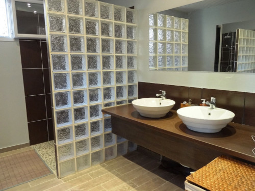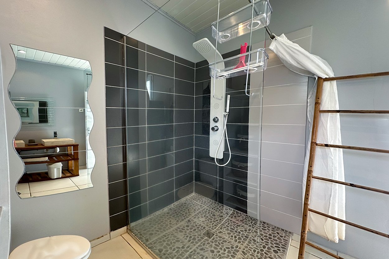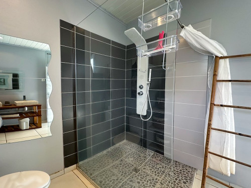 - une salle de bain avec toilettes, grande douche à l'italienne