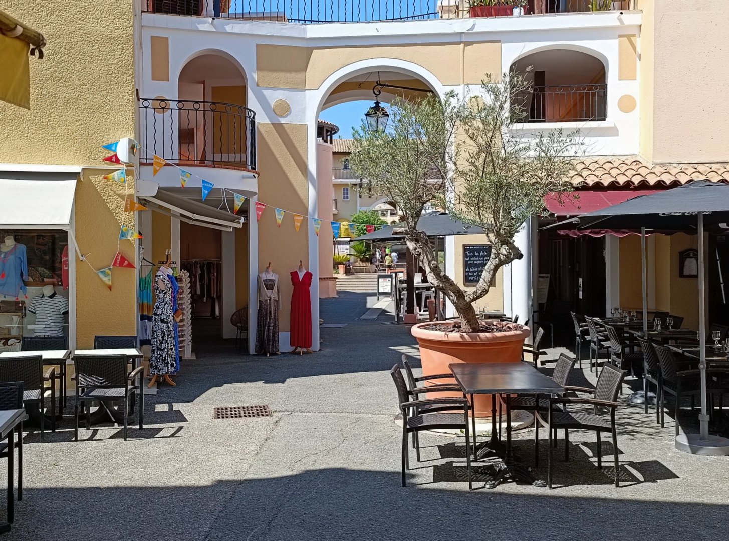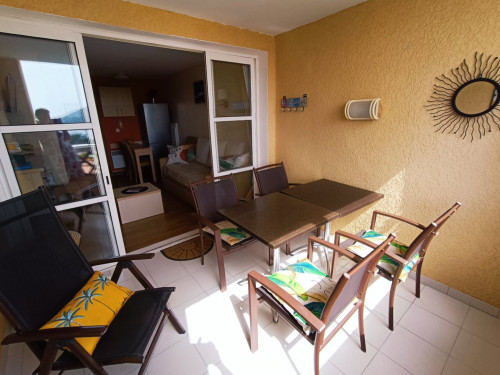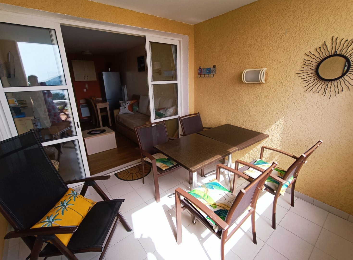 🌅Terrasse abritée avec tables et chaises , fauteuil relax, parasols