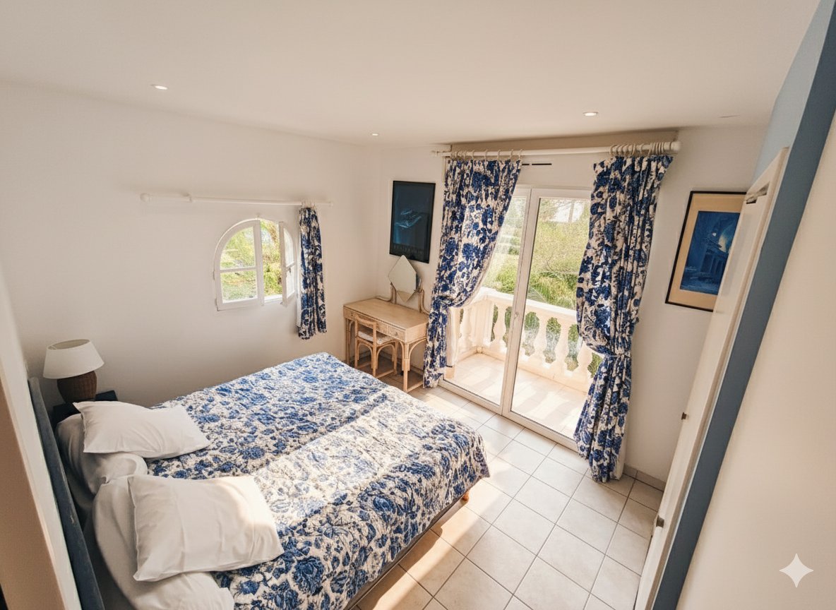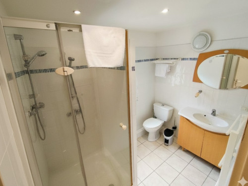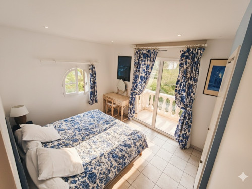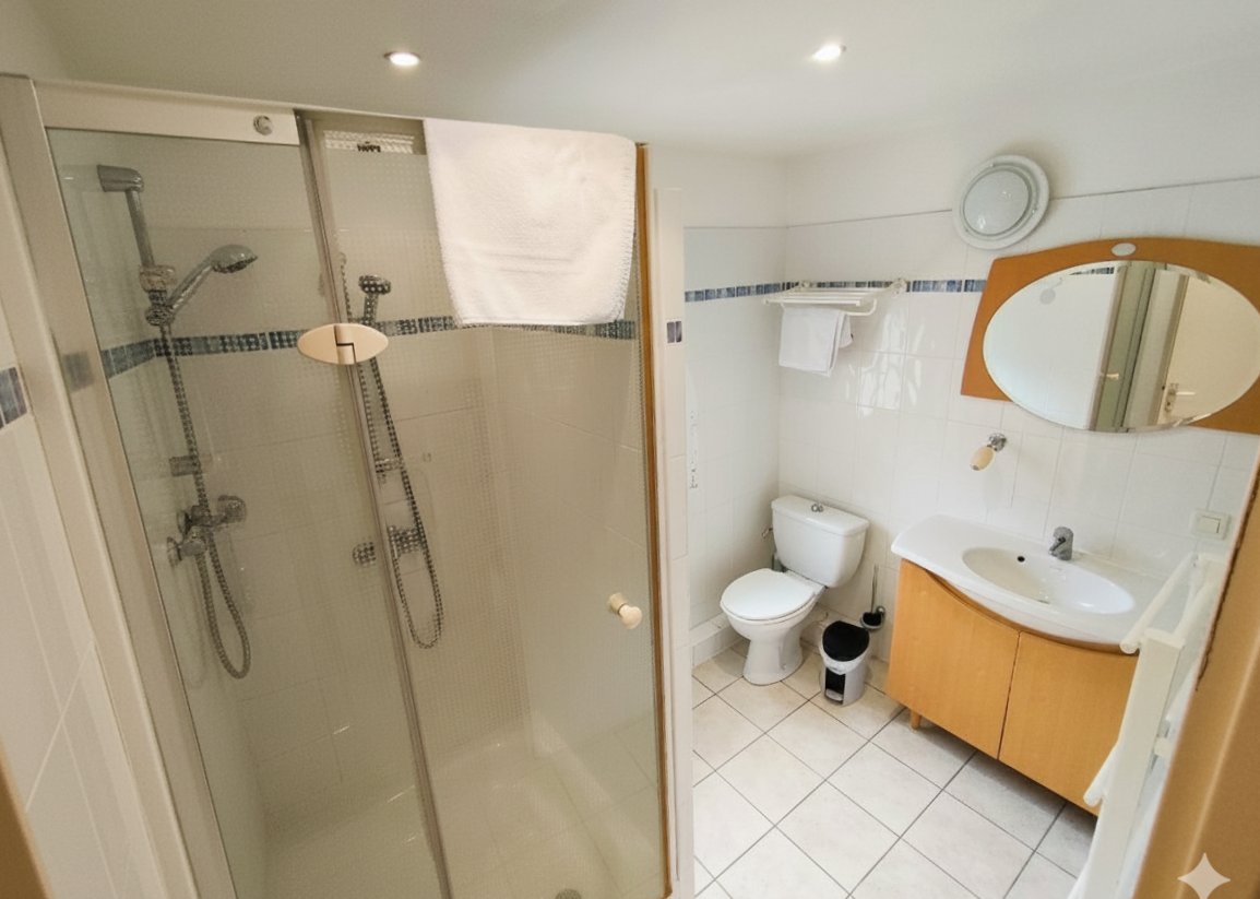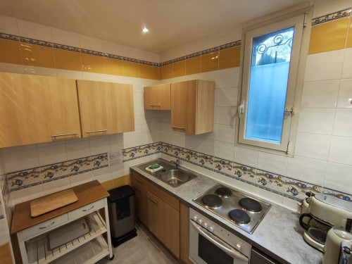 Appartement en rez-de-jardin composé d’une cuisine, d’un séjour (avec canapé convertible 2 couchages) avec une grande terrasse au sud sur le jardin méditerranéen et sur le piscine.