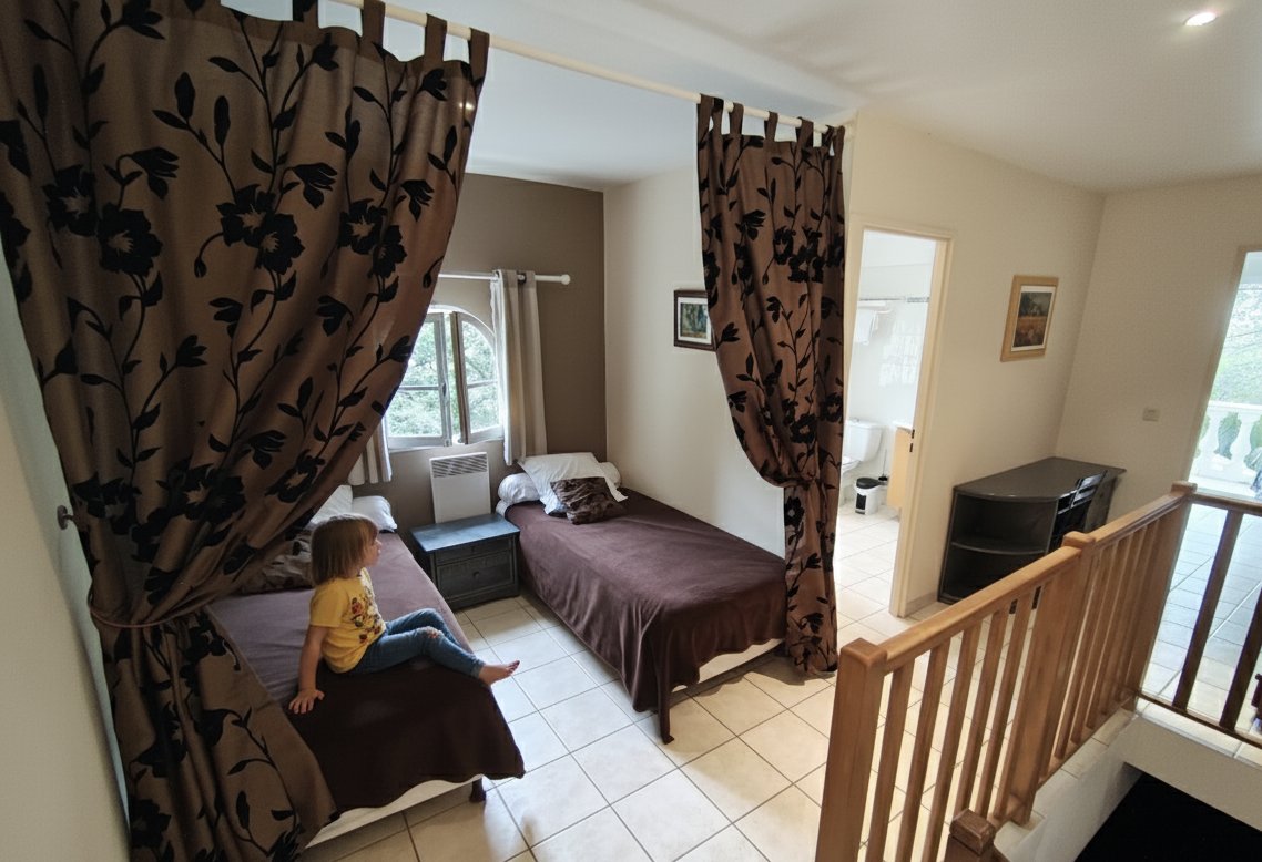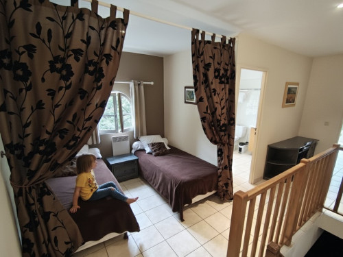 À l’étage un dégagement avec 2 lits (90x200 cm), une salle de douche et une belle chambre 2 lits (90x200 cm)