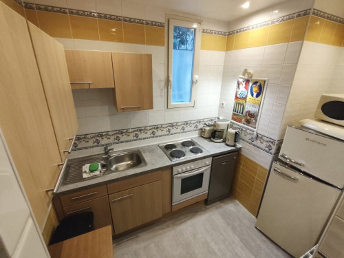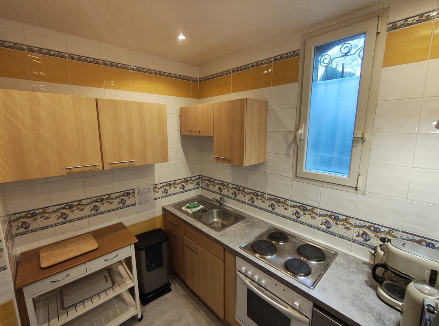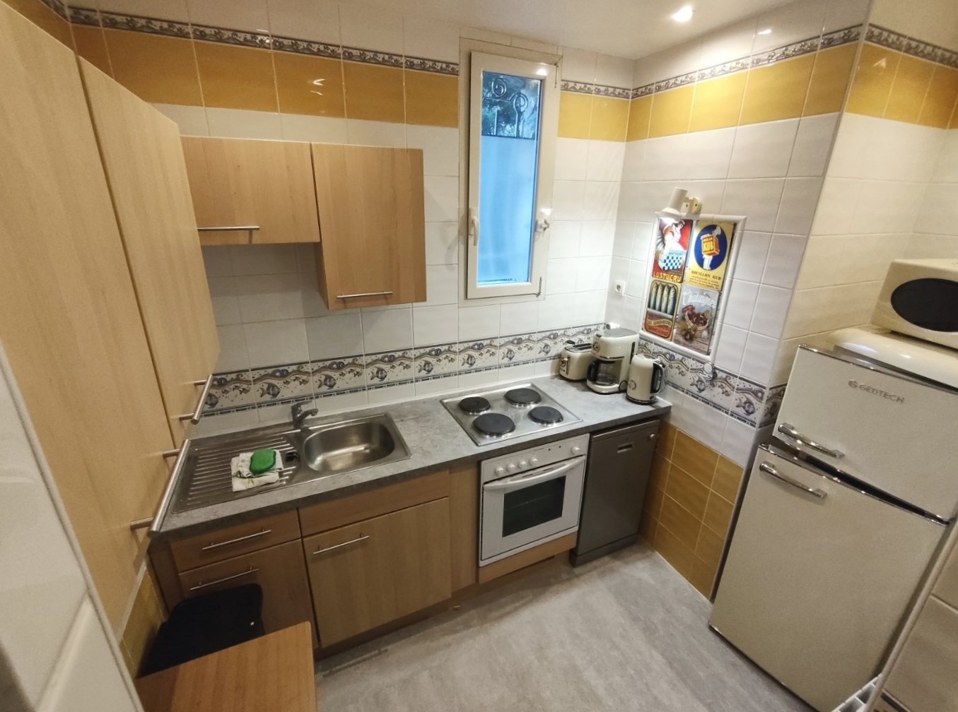 Cuisine équipée (plaque chauffante, réfrigérateur, micro-ondes, lave-vaisselle, cafetière, lave-linge).