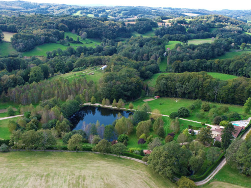 À 2 km un ancien corps de ferme restauré sur 8 ha de prairie et bois, agrémentée de 2 étangs dont un de 5000 m² le paysage vallonné et boisé