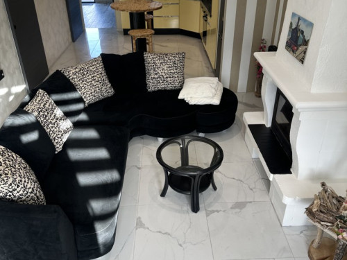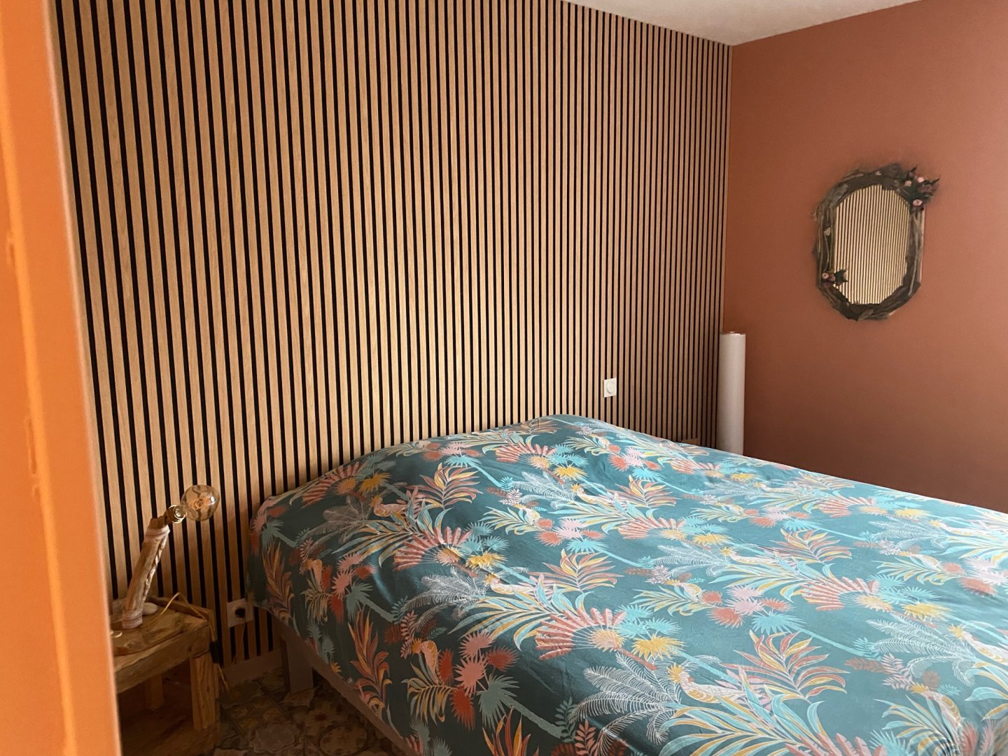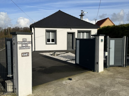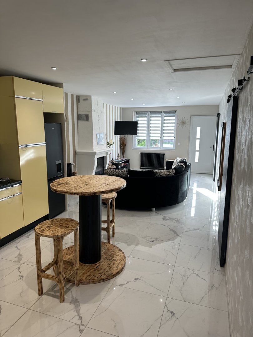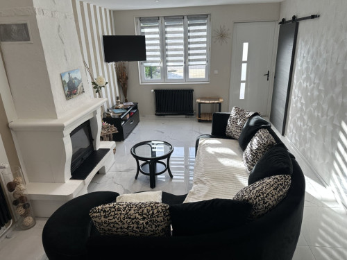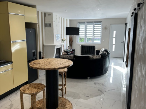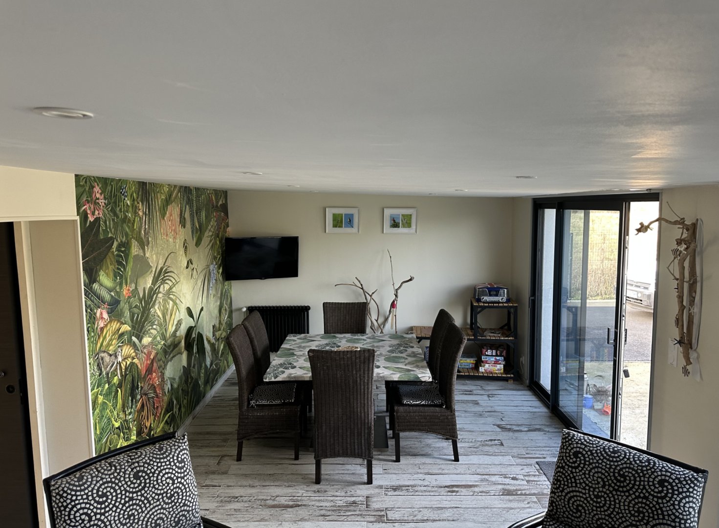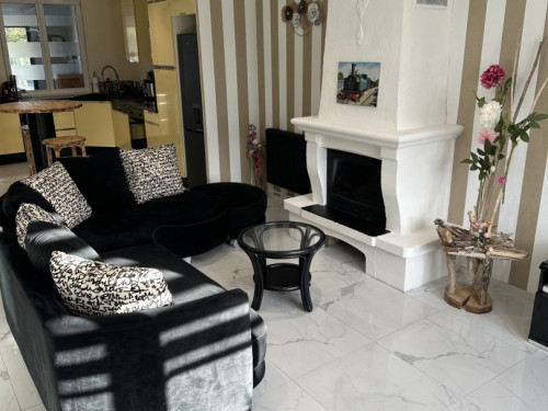 Maison de plain-pied avec une cuisine aménagée, un salon avec cheminée, une salle de bain avec douche italienne, un WC, deux chambres avec un lit grand format de 180 et deux petits lits de 90 ou un autre Grand format, une salle à manger.